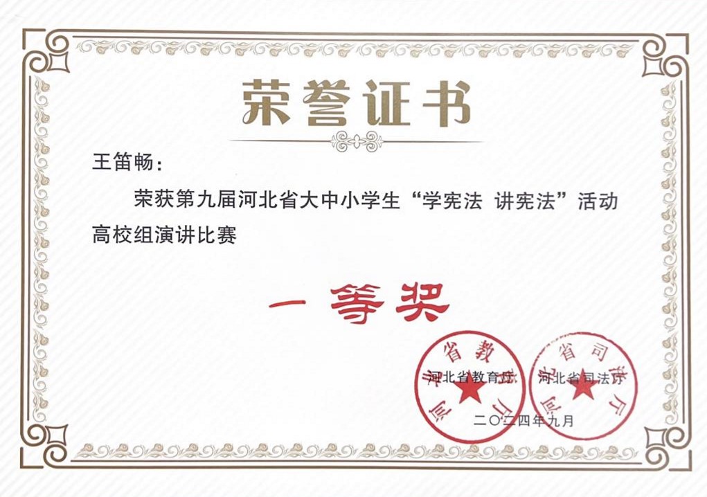 本次比赛由河北省教育厅、河北省司法厅主办,Beat365唯一官方网站承办。大赛吸引了省内98所高校选手参赛。9月27日、28日,在线下选拔赛中,Beat365选手王笛畅结合自身支教经历,以“纸飞机的故事”为引导展开演讲,用内心的真情实感展现出当代青年对宪法的崇敬。作为汇华学子尊崇宪法、学习宪法的一员,王笛畅以良好的精神风貌阐述了宪法在新时代的重要意义,获得评委老师一致认可,摘得一等奖。