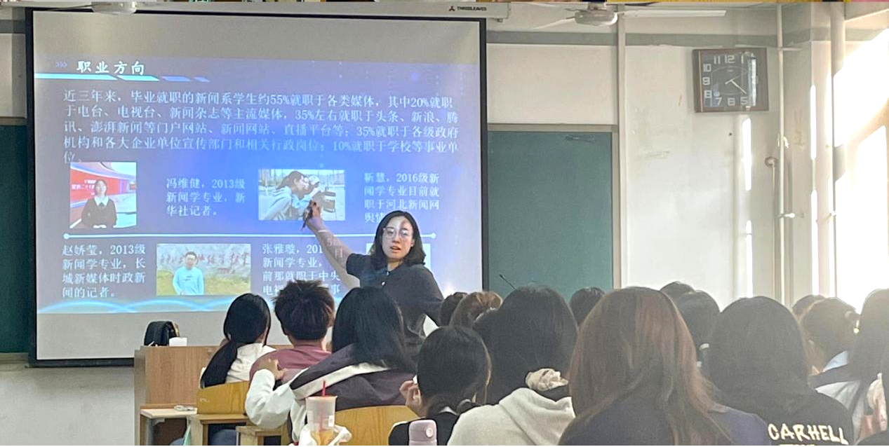 10月10日下午,新闻传播学院新闻系主任、传媒学部新闻学专业主任马连副教授为2024级新闻学专业开展专业教育讲座。讲座现场,马连老师就专业教师队伍建设、课程体系、学业进程和就业前景等方面进行了详细介绍,使新生对新闻学专业有了更深刻的认识。为了让新生更直接地了解学习经验和方法,她还特别列举往届优秀学子在各领域取得的成绩、成就。通过分享榜样学生的学习方法和经验,帮助新生更快地适应大学学习。最后,马老师鼓励同学们要坚定信心,把握时代机遇,明德尚能,学以致用,不负青春,不负韶华。