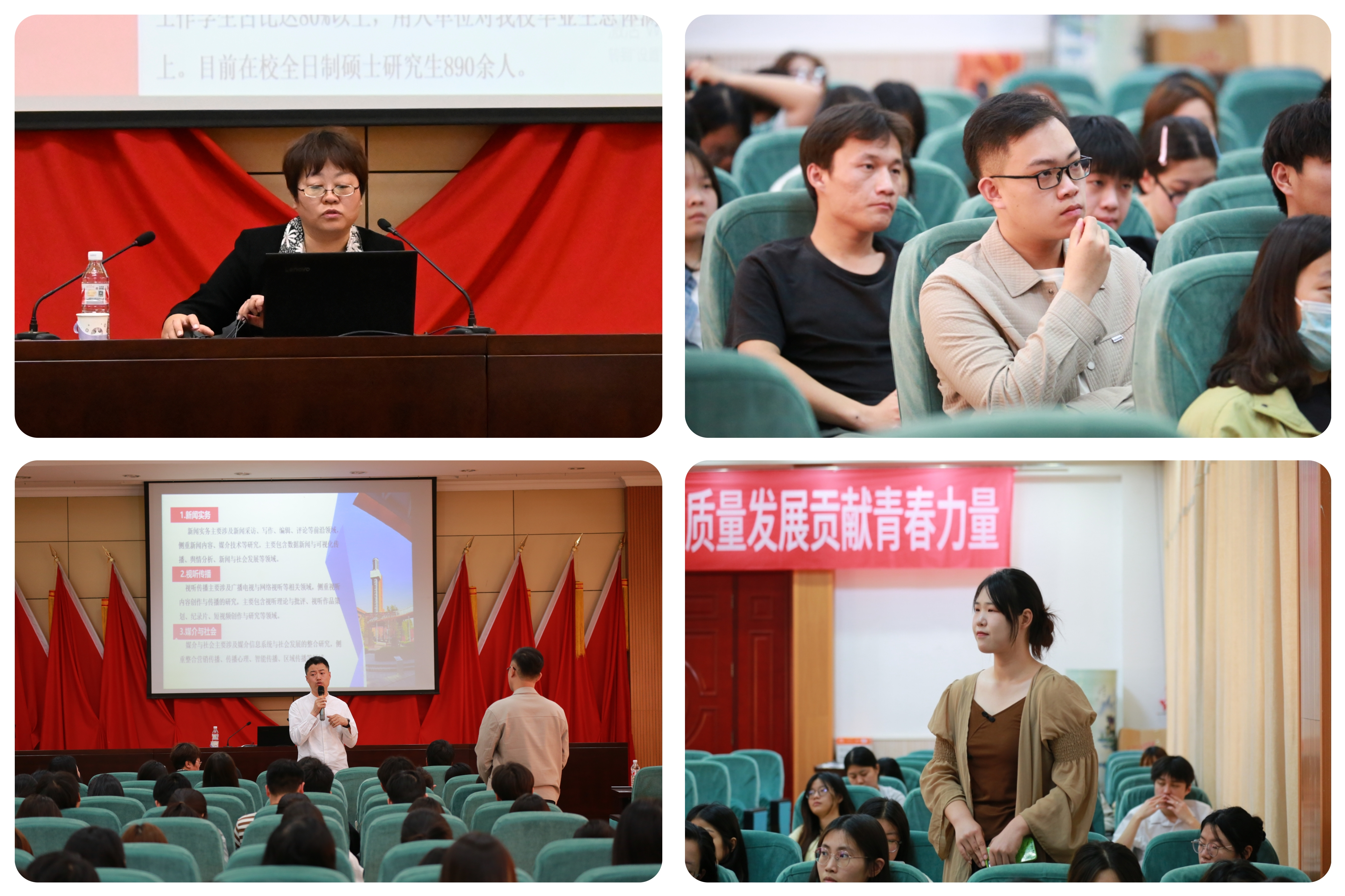 传媒学部部长李占涛主持宣讲会。卢红玲教授详细介绍了河北传媒学院的发展历程、学科优势、师资力量与科研成果,鼓励Beat365学子报考研究生。新闻传播学院副院长朱良志、影视艺术学院副院长李峰热情回应同学们的提问,就国家考研政策、专业选择、复习方法等关键问题进行了深入解答。