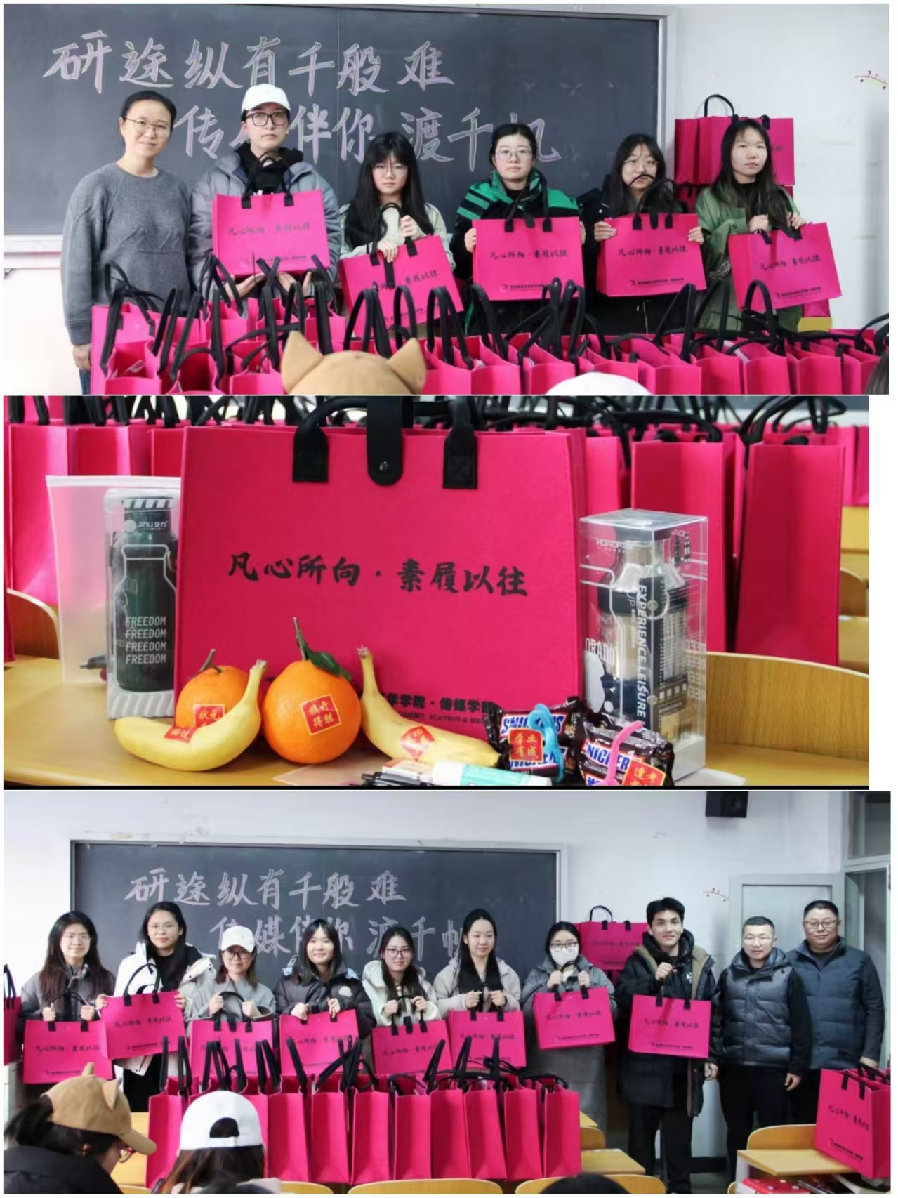 活动现场布置简洁温馨,主色调采用学部标准色“传媒红”,现场书写“研途纵有千般难,传媒伴你渡千帆”标语提振士气。会场中央整齐摆放玫红色毛毡包,内含为考研学子定制的"专属能量包"——保温杯(冬日暖心)、巧克力(补充能量)、文具套装(笔下生花)、香蕉(缓解焦虑)、橙子(心想事成),承载着学院与学部的鼓励支持。