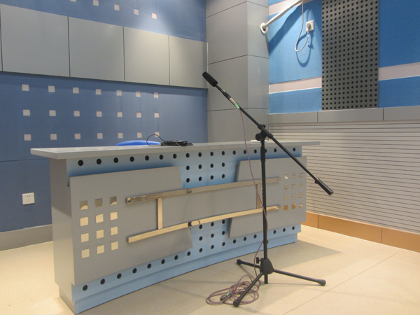 图-5 录音间内景,配有指向性电容话筒、采访话筒、界面话筒,具备专业吸音墙壁、隔音门