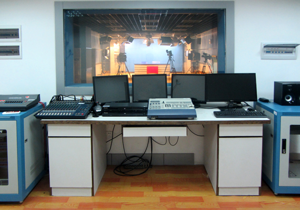 图-1 2010年建立的传媒学部演播室,总面积110平方米,配备控制间、演播厅、录音室,可供同学们进行电视新闻、电视广告、录音技术等专业实践。