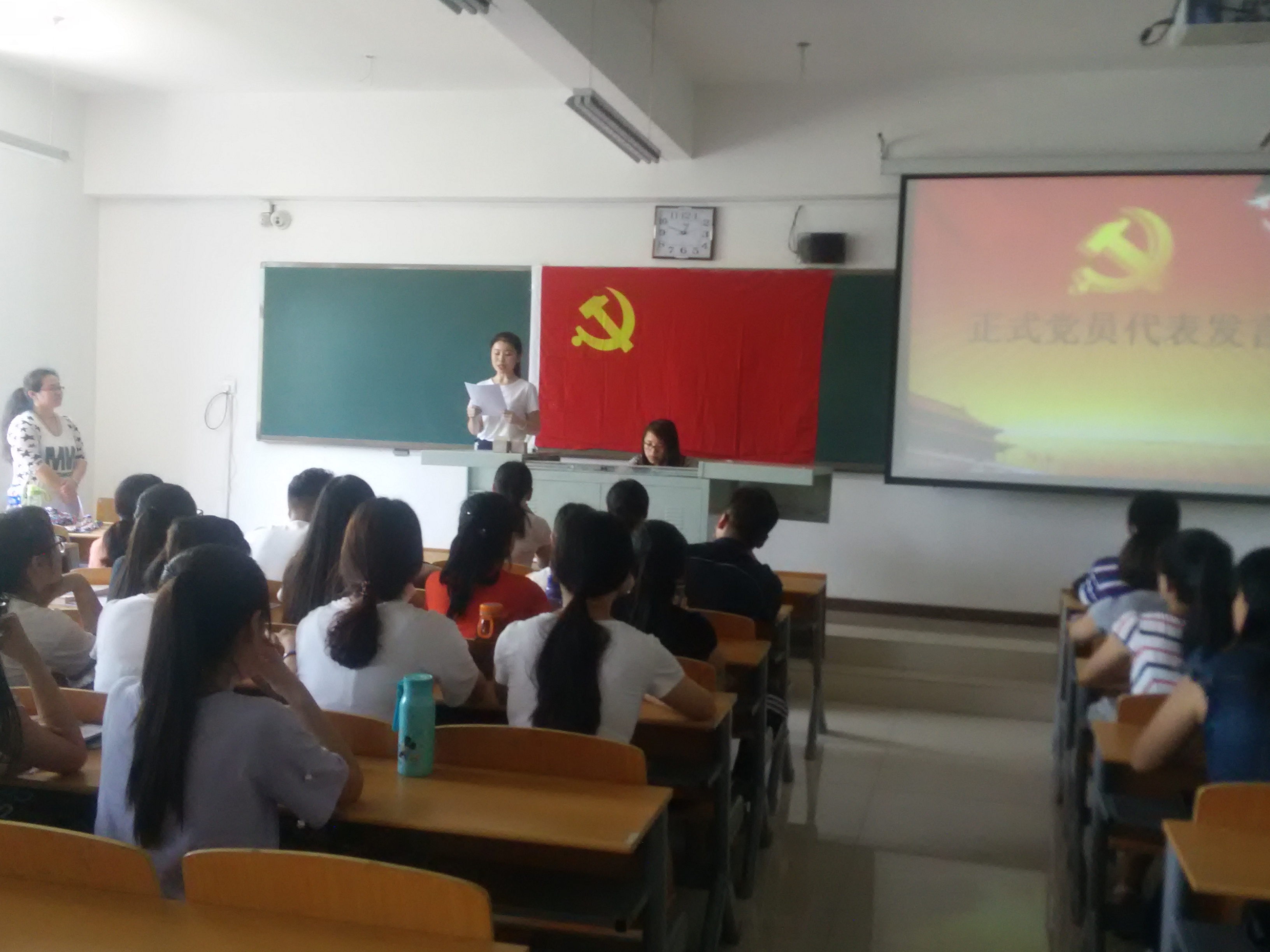 教育法政学部举行预备党员宣誓仪式-缩小 放大+ 2016-06-246月22日,教育法政学部党总支在第六教学楼403室举行了预备党员入党宣誓仪式。学部党员、积极分子及学部总支委员、支部书记近百人参加了此次宣誓仪式。仪式由总支组织委员张娜主持。 大会伊始,总支委员张娜阐述了入党宣誓的重要意义。接着,会全体起立奏唱雄壮激昂的《国际歌》,之后正式党员龚雪同志带领14名新党员进行入党宣誓,宣誓过程庄严凝重,现场响起阵阵激昂的宣誓声,每个同学都用发自内心的声音抒发对党忠诚的决心,面对着党旗,大家接受了一次身心的特殊洗礼。预备党员代表徐子感谢的党组织长期培养,表达了恪守在党旗下的诺言、对党忠诚、为党和人民尽职尽责、努力使自己成为一名优秀的共产党员的决心和信心。正式党员代表龚雪以一个老党员的身份讲述她对于入党的认识以及对新党员的几点要求和期望,并党员、积极分子发出诚信考试的倡议。从积极分子代表白丹萍的发言中,大家听出了积极分子向党组织靠拢的决心并为之付出的不懈努力。 最后,学部党总支书记周桂英老师讲话,她强调,预备党员参加宣誓仪式就意味着完成了组织上的入党,但还要进一步做到思想上入党,行动上入党,这是一个长期的过程。要牢记自身的党员身份,严格要求自己,体现党员的先锋模范作用,做一名有理想、有抱负,坚持全心全意为人民服务的合格共产党员。 此次宣誓仪式有助于广大学生党员铭记入党誓言,增强党员自豪感、荣誉感,在日后的学习生活中自觉担负起光荣的责任和使命,为党的伟大事业做出应有的贡献。