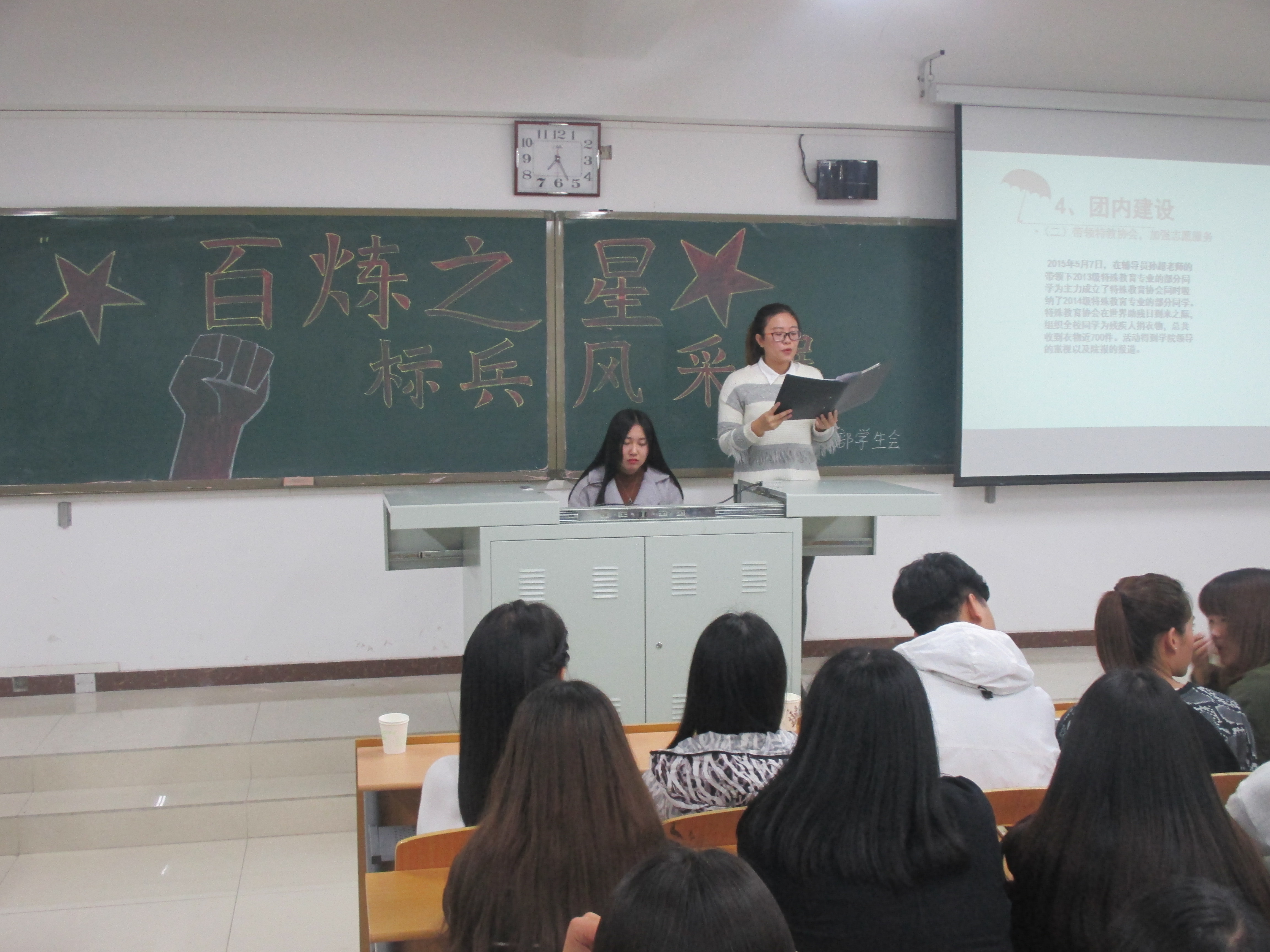 教育法政学部“百炼之星-标兵风采展”活动圆满举办-缩小 放大+ 2016-11-02为帮助广大新生树立正确的价值观、人生观,养成拼搏进取、奋发有为的良好品质。教育法政学部于10月31日在第六教学楼403教室,举办了“百炼之星-标兵风采展”活动。 本次活动以学习标兵、运动标兵、实践标兵、标兵宿舍、标兵班集体共五个层面选取优秀代表为全体新生进行汇报。学习标兵张明雪,品学兼优,获得2015-2016学年国家奖学金荣誉,在努力学习的同时还积极地做好班内的各项工作,并在顶岗实习的过程中的优异表现赢得学校和老师的认可,“踏实”是她一直以来的态度;运动标兵石小萌,积极各类体育活动,无论是运动会还是羽毛球赛,她都收获诸多荣誉,运动赛场上挥洒汗水,学习生活中持之以恒,“拼搏”是她生活的最好主题;实践标兵孙旭,通过自己的不懈努力,带领特教协会积极为残障人士提供帮助,获得石家庄市优秀青年志愿服务组织荣誉称号,她用自己的努力定义了“奉献”的新内涵;标兵宿舍是来自2013级小学教育专业328宿舍,她们团结友爱、互帮互助,学习氛围浓厚,学习成绩骄人,每个宿舍成员在学习和工作中都取得了好成绩,“共进”成为她们共同的诺言;标兵班级体是来自2013级特殊教育1班,他们注重班级凝聚力,把每个同学的奋斗目标融入到整个集体当中,充分发挥专业优势,积极投身到扶贫助残的事业当中,他们的优秀表现获得省级先进班集体称号,“团结、进取”是他们共同的心声。标兵个人和集体慷慨激昂的发言,感染了每一位到场听众,他们的努力、成长,看似平凡简单,却无不在用青春之火诠释着新时代的职责,这就是身边的标兵,这就是我们的榜样。