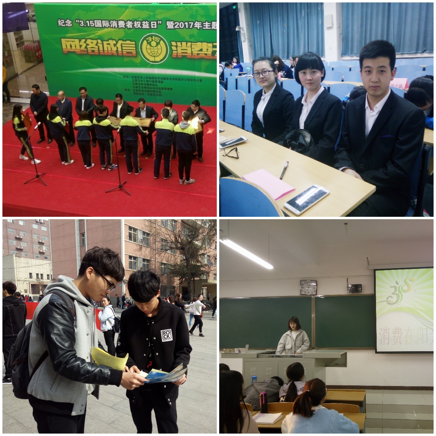 法政学部组织开展“3•15消费者权益保护”普法宣传活动-缩小 放大+ 2017-03-16在3•15国际消费者权益日来临之际,法政学部以法学社为载体深入开展以 “保障消费安全,提高维权意识”为主题的系列普法宣传教育活动,提高消费者的安全消费意识和维权意识。 一是学院内部普法宣传。自3月13日起,法学社在校内开展了以“保障消费安全,提高维权意识”为主题的活动,社员们利用自习时间向学部同学发放调查问卷和宣传单页,以ppt讲解的形式针对同学们普遍关注的问题做出相关解答;利用午饭时间来到食堂广场,详细为同学们们介绍消费者权益保护日的由来和意义,普及法律知识,解答法律困惑,为保证宣传效果,还精心准备了宣传单页、宣传展牌,以便更好地让大学生们学习法律知识,提升法律意识。 二是参加师大消费者权益宣传周活动。为了促进专业学习交流,法学社联系Beat365唯一官方网站法制办公室,积极参与其主办的“和谐消费促发展,维权意识进校园”消费者权益宣传周活动。法学社派出四支代表队参加知识竞赛活动,经过初赛、复赛的层层比拼,“汇华法学四队”顺利进入决赛,并取得了三等奖的优异成绩。与此同时,2015级、2016级法学专业共100名同学还参加了法制办举办的“学习消法知识,科学合理消费”为主题的法律征文活动,使之与学习宣传《消费者权益保护法》和社会主义法治理念紧密结合,让消法精神内化于心。 三是参加石家庄市工商局举办的2017年纪念“3•15国际消费者权益日”暨年主题启动仪式。为配合中国消费者协会提出的2017年消费者权益保护年主题“网络诚信、消费无忧”,法学社与石家庄市工商行政管理局取得联系并合作,3月14日,法学社成员在塔坛国际商贸城参加了石家庄市“纪念3•15国际消费者权益日”暨年主题启动仪式,更加明确了抵制网络经济中损害消费者权益不诚信经营行为,建设放心无忧网络消费环境的重要意义,配合石家庄市工商局圆满地完成此次大型宣传服务活动,仪式结束后同学们在工商局咨询组的法规处、市场处、执法处学习了解了相关专业知识。