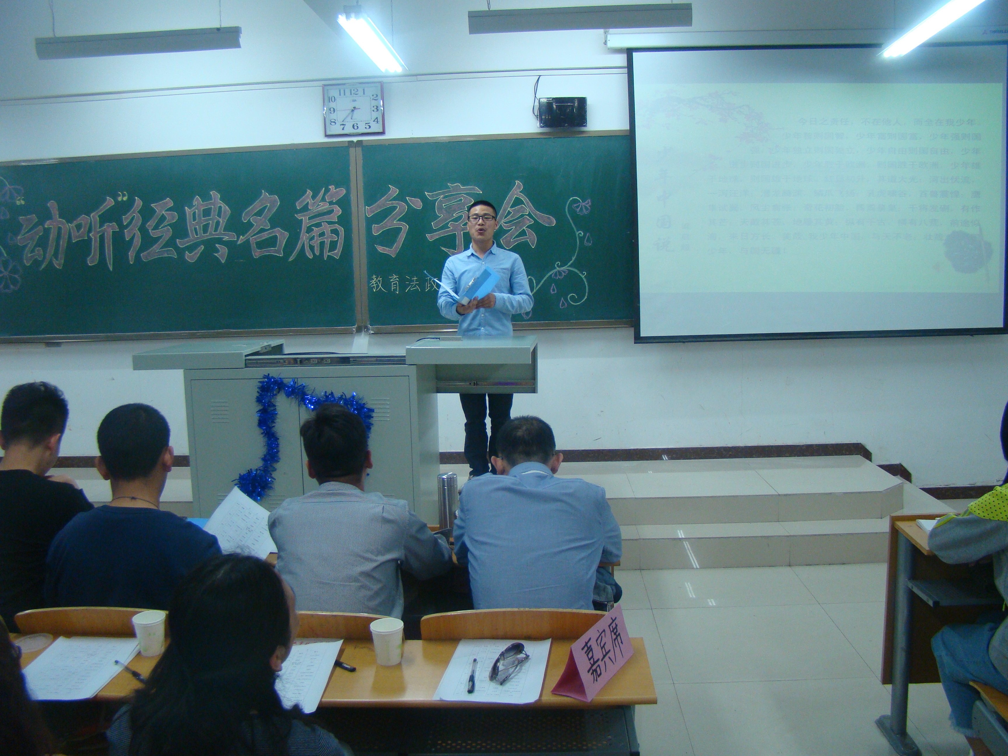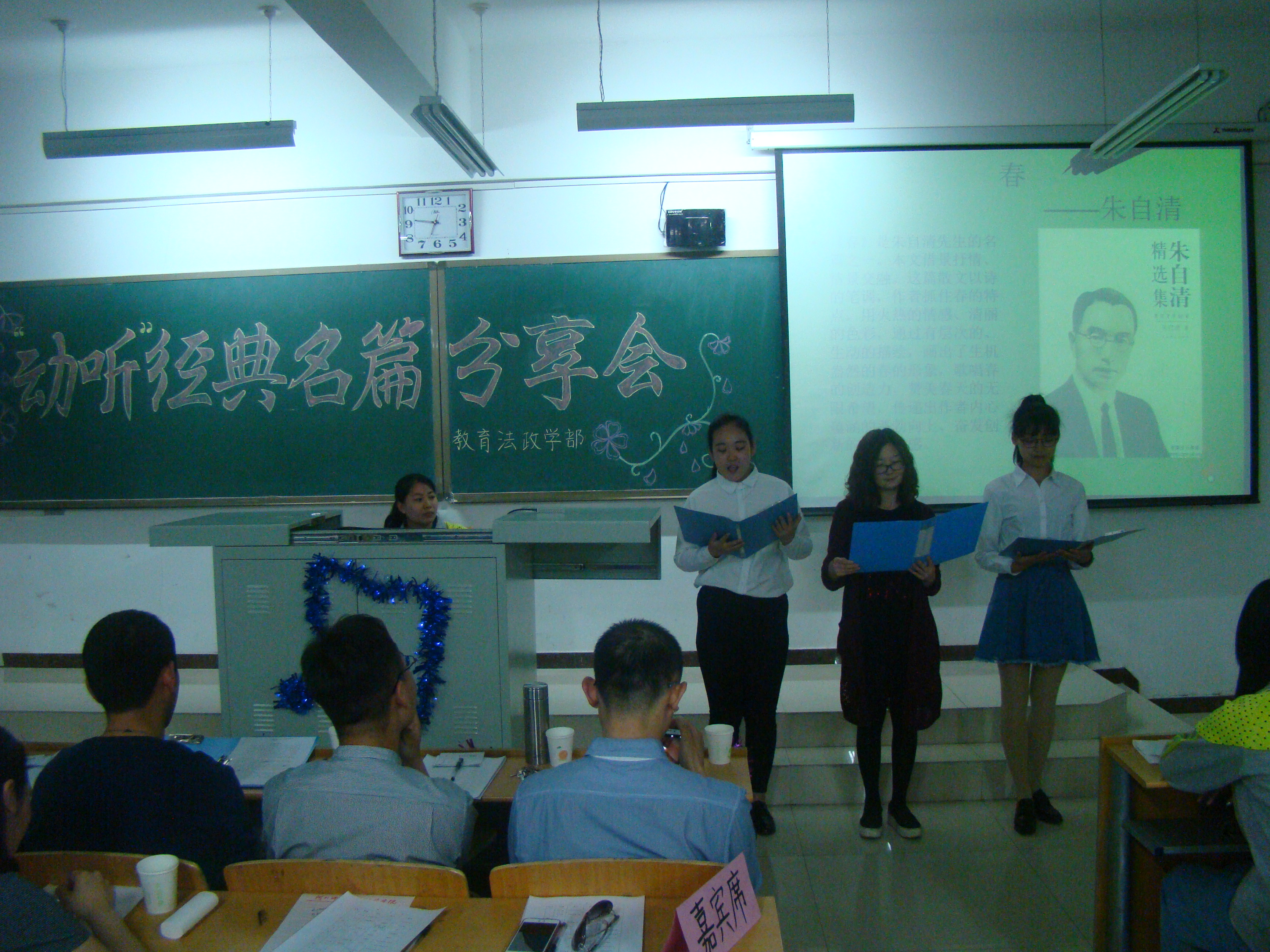 教育法政学部举办“动听”经典名篇分享会-缩小 放大+ 2017-04-25在世界读书日到来之际,教育法政学部于4月21日晚,在北院六教304教室举办了“动听”经典名篇分享会,学部部长周桂英与师生们共同聆听了分享会。 此次分享会中,由前期经过层层选拔脱颖而出的10名同学,为师生们带来了10篇经典名篇的分享。王志明同学朗读了《少年中国说》,慷慨激昂的朗读让观众们领略到一代国学大师梁启超先生对民族的热爱和对青年担当重任的期望;刘丽同学为大家带来了徐志摩的《再别康桥》,再现了作者对往昔康桥岁月最真实美好的回忆;刘春雷同学分享了高尔基的《海燕》,“让暴风雨来得更猛烈些吧”是这位文学大师不屈性格的最好体现;刘紫涵深情朗诵了史铁生的《奶奶的星星》,“那些星星都是死去的人变的,为了给活着的人把夜路照亮”,短短的语言饱含着作者对亲人的思念。