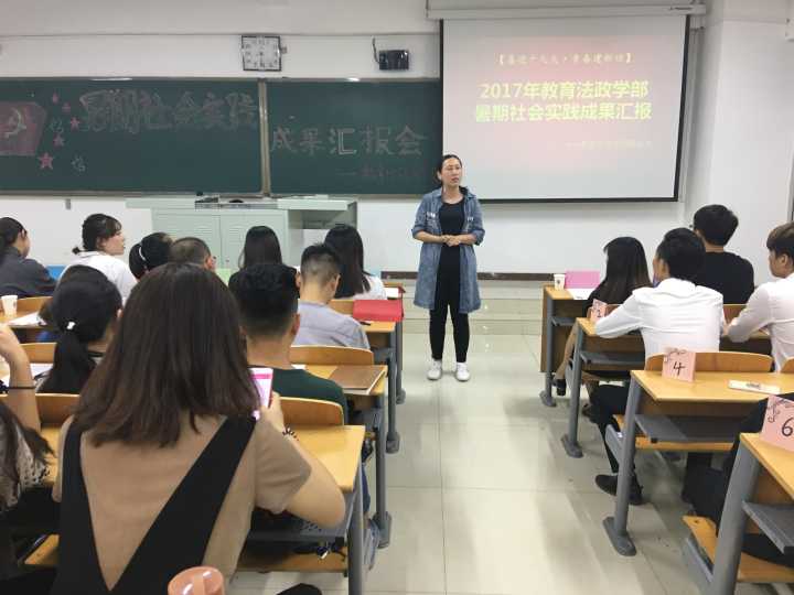 “喜迎十九大 青春实践行”教育法政学部2017年暑期社会实践活动圆满落幕-缩小 放大+ 2017-09-26在党的十九大胜利召开前夕,为鼓励引导青年学生深入社会、了解国情、关注民生,9月22日教育法政学部在第六教学楼303教室举办“喜迎十九大 青春实践行”暑期社会实践成果汇报活动,部长周桂英及全体辅导员老师与2017级同学们参加了本次活动。