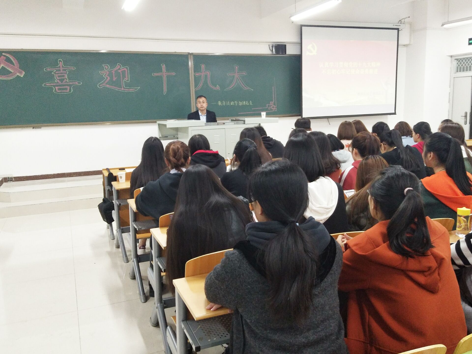 教育法政学部举办“不忘初心,牢记使命,奋勇前进”学习十九大精神专题讲座-缩小 放大+ 2017-11-0710月31日晚,教育法政学部在北院第五教学楼404室举办“不忘初心,牢记使命,奋勇前进”学习十九大精神专题讲座,邀请到河北省图书馆馆长、河北文化信息资源共享中心主任、中国图书馆学会文化创意工作委员会主任李勇,为2016、2017级学生详细解读十九大精神。 在活动中,李勇从党的十九大的历史地位、理论创新、党的辉煌成就以及新一代青年应肩负的历史使命四个方面详细阐述党十九大的重要内容。他强调,党和国家事业之所以能在各种风险挑战中破浪前行,取得历史性成就,发生历史性变革,根本原因就在于以习近平总书记为核心的党中央科学运用治国理政的新理念、新思想、新战略。习近平总书记在十九大上的报告,是中华民族走向复兴的伟大宣言,是今后各项事业和工作的指南针,全体青年学生应该认真学习贯彻党的十九大重要精神。李勇精彩细致的讲解引得在场学生的阵阵掌声,许多学生边听边写,认真记录相关内容,仔细揣摩领会所讲的含义。对于在场学生的疑问,李勇做了准确清晰的解释,认真地聆听、热烈的气氛、温暖的互动是全体学生学习十九大精神,在新时期新征途再次起航的最好宣言。在活动的尾声,李勇对在场青年学生提出希望,他说:“青年者,人生之王、人生之春、人生之华,今天我们的年轻人生活在一个伟大时代,也注定会成为这个时代的推动者”。