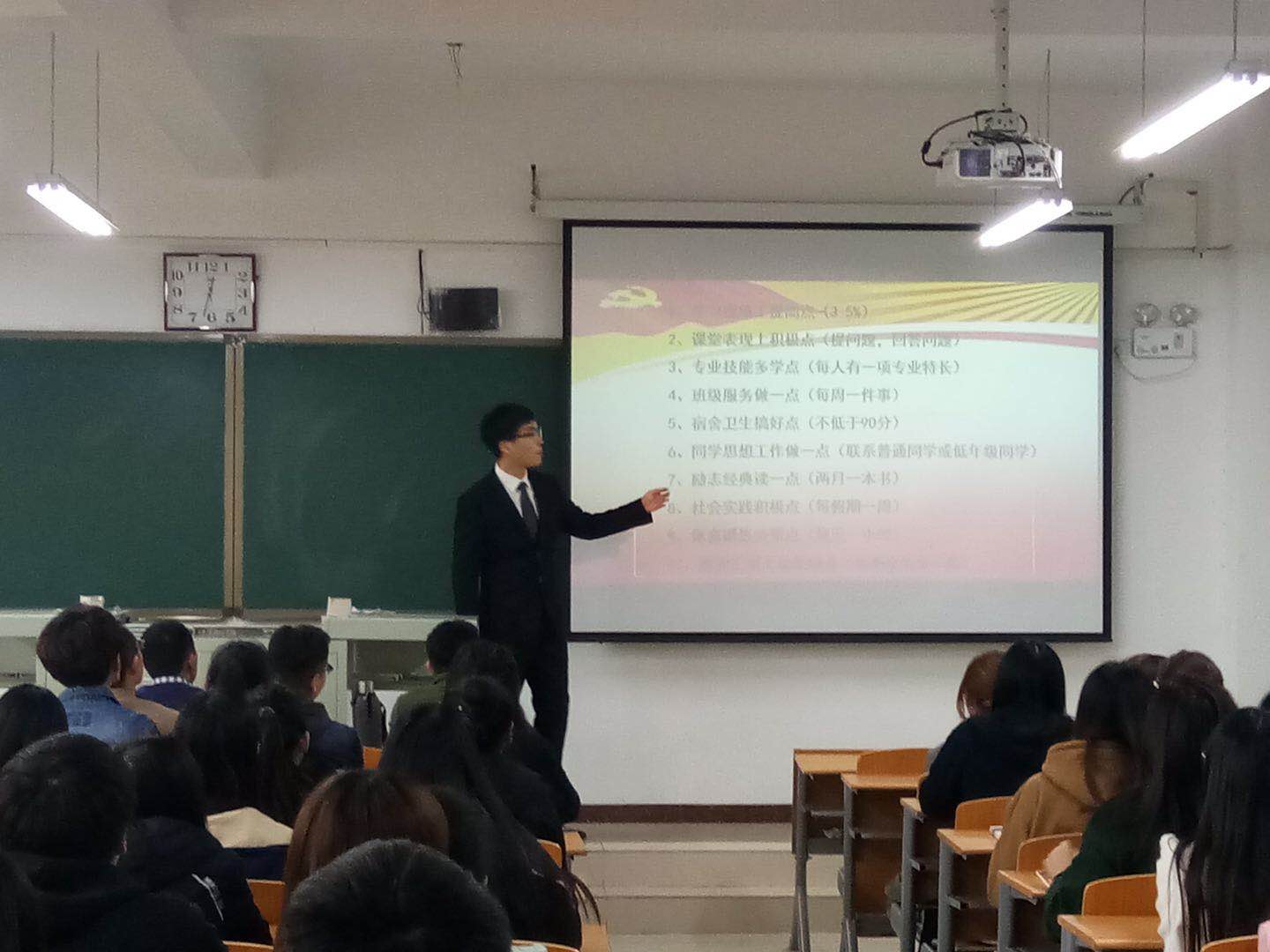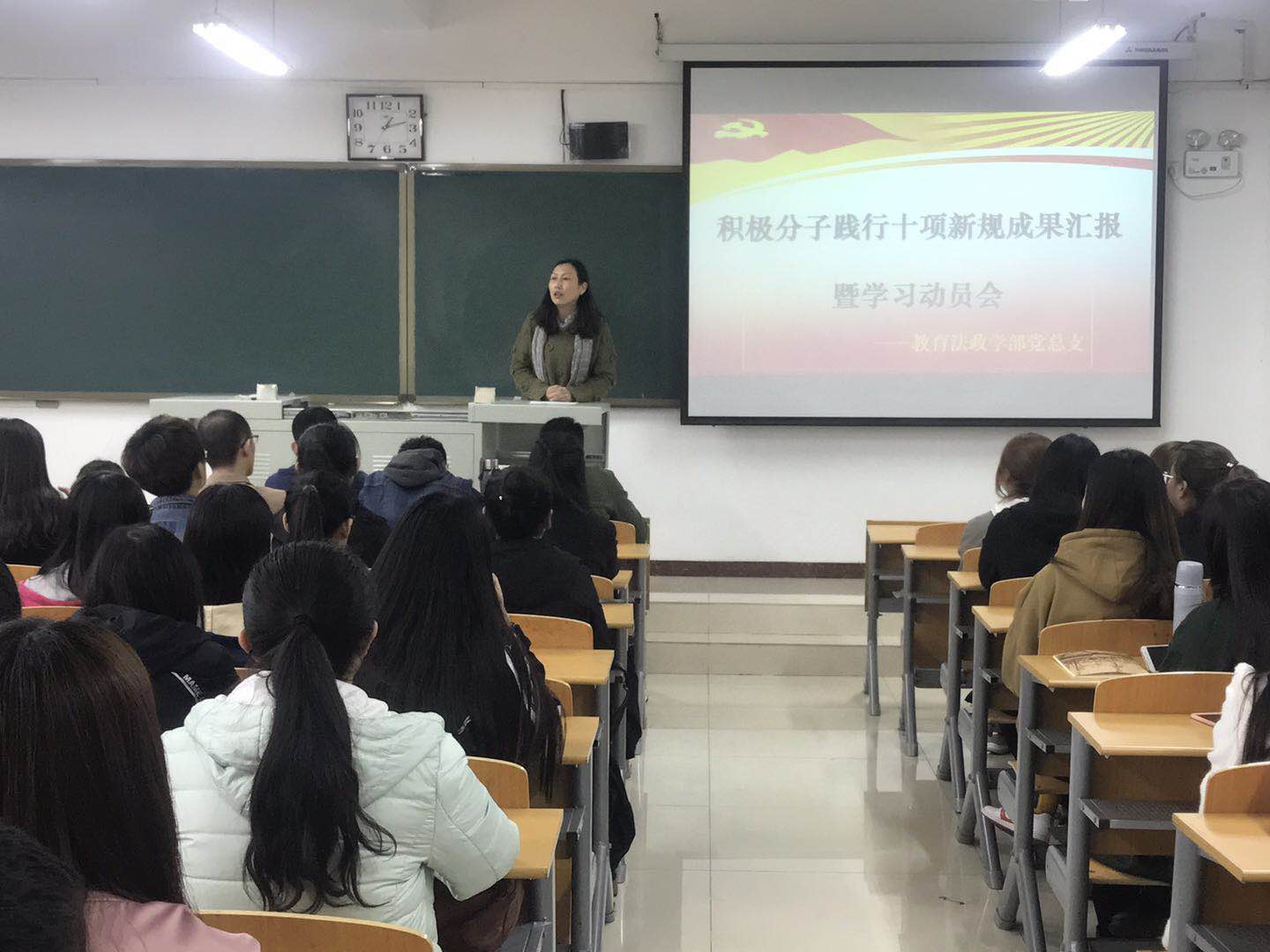 教育法政学部党总支举办积极分子践行十项新规成果汇报暨学习动员会-缩小 放大+ 2017-11-1611月9日,教育法政学部党总支在第六教学楼404教室举办积极分子践行十项新规成果汇报暨学习动员会,学部党总支委员、学生党支部书记及积极分子百余人参加会议。 主持人首先带领新确定的积极分子学习了《教育法政学部入党积极分子修养与践行十项新规》的具体要求,通过十条具体的量化措施使同学们明确自己的努力方向。接着,四名优秀入党积极分子代表进行了学习、践行十项新规的个人风采展示。他们从个人的思想、工作、学习、生活等各方面,汇报了自己被确定为积极分子以来取得的成绩和进步,用实际行动说明了“学习成绩上提高点”、“专业技能多学点”、“班级服务多做点”等十项新规对个人发展的促进作用。通过这些身边榜样的力量,激发了在场积极分子成长、进步的动力。