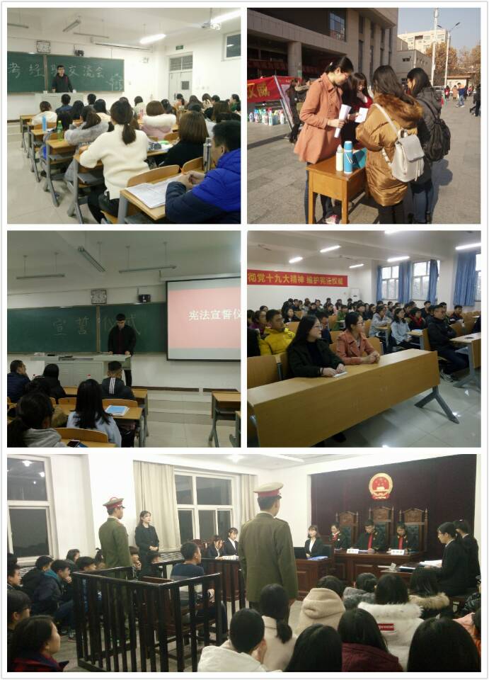 法政学部开展国家宪法日法律宣传活动-缩小 放大+ 2017-12-12为进一步树立了宪法意识,弘扬宪法精神,法政学部开展以“学习贯彻党的十九大精神,维护宪法权威”为主题的国家宪法日法律宣传教育活动。 宪法宣誓,提升宪法意识。12月4日,法学社在第六教学楼305教室举行宪法宣誓活动,活动首先由学部部长周桂英致词,她表示,开展宪法宣誓活动意义深远,有助于未来法律人信守承诺,形成对宪法的信仰。作为法学专业学生要适应新时代的要求,勇担历史责任,不仅要做法治中国前行的受益者,更应该是宣传者、参与者、推动者,通过自己的行动营造学法、遵法、守法、用法的良好氛围,推动法治建设。接着由法学专业学生代表王加正发言,他阐述了宪法的重要意义、价值,表达了努力做一名有信仰、有担当的法律人的决心。最后,全体在场成员起立向宪法宣誓,承诺将忠于宪法,维护宪法权威。宣誓仪式结束后,同学们纷纷在宪法日主题条幅上签名。 法律咨询,铸就法治校园。12月3日、4日,法学社在食堂东广场开展了宪法宣传与法律咨询活动,向广大同学发放宪法知识宣传单页,宣传法律知识,解答法律困惑,让法律走出文本,走进生活。并进一步推广法学社公众号“汇法范儿”网络媒体法律援助方式,更加便捷地让大学生们获得法律常识,提高法律意识。 模拟法庭,强化第二课堂。12月10日,法学社组织开展以“案例情景再现,法庭审理剖析”为主题的模拟法庭活动。活动以情景再现的形式为同学们讲述身边的抢劫案例,目的在于提高同学们的法律意识,增进对第二课堂的认识,并且在欢快的活动中体验辨控诉三方角色,从而了解我国司法系统的运作模式,培养法学专业学生的法律思维,提高其应用法律知识的水平,能够在知法的基础上,做到懂法、守法、用法。 司考交流,树立信心扬帆起航。11月26日,法学社在北院第六教学楼305教室召开了“司考经验交流会”,近百名法学专业学生参加了交流会。活动邀请了在司法考试中脱颖而出的的李沛泽、李吏昌和庞陆乾三位同学为学弟学妹们传授经验,解疑答惑。他们对司法考试进行了全面的解析,并对准备司法考试的时间安排、复习的侧重点及注意的问题结合自身经验进行了详细地说明,让同学们进一步明确了准备司法考试的方向和目标,也激励同学们提早为司考做准备。 本次国家宪法日系列法律宣活动是以十九大精神为引领,深入学习贯彻十九大报告中提出的深化依法治国实践,加大全民普法力度,建设社会主义法治文化,树立宪法法律至上,法律面前人人平等的法治理念。通过法学专业学生自己的努力营造尊法学法守法用法的良好社会氛围,更好地普及宪法知识,弘扬宪法精神。