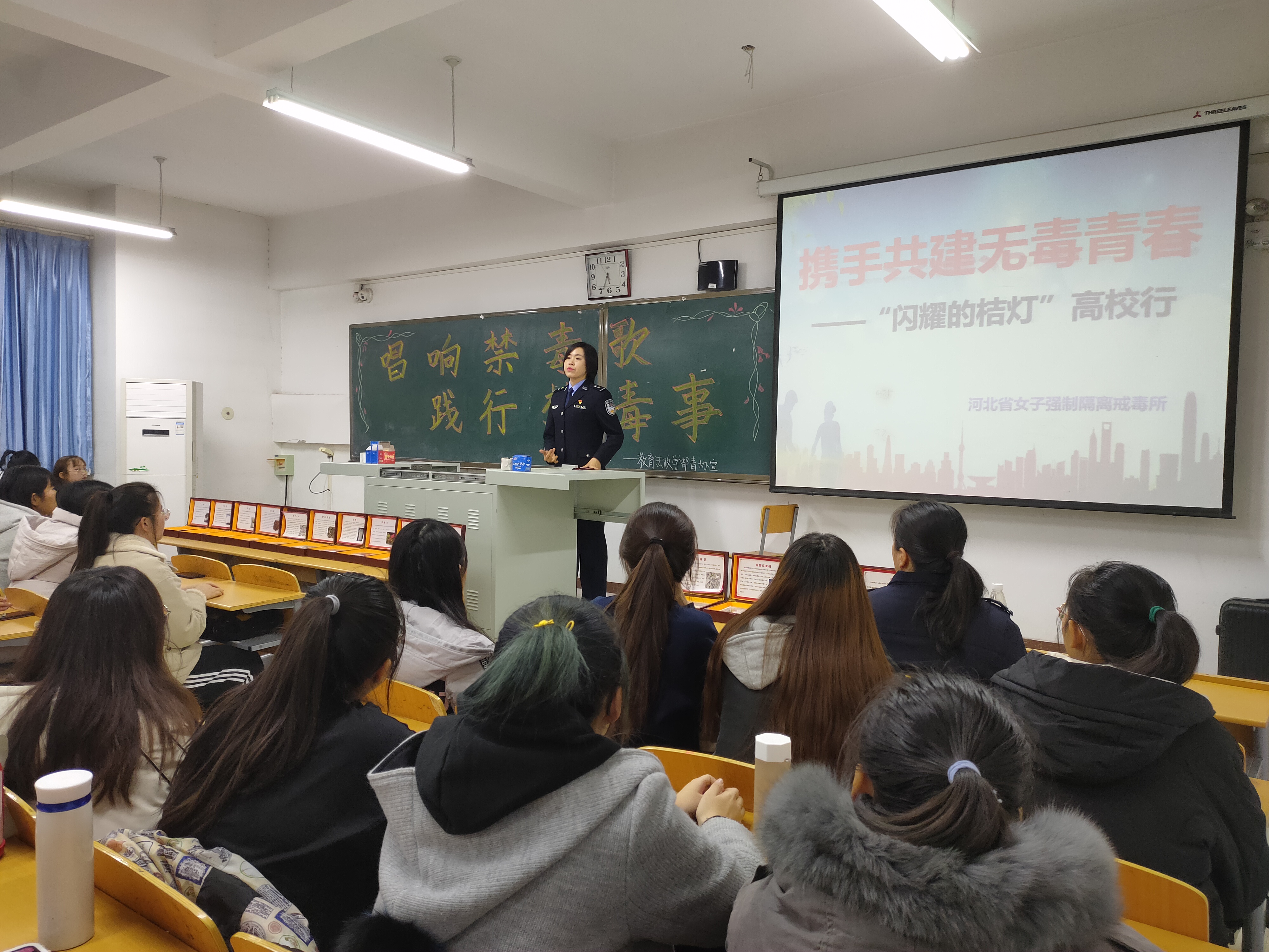 教育法政学部举办“唱响禁毒歌,践行禁毒事”活动-缩小 放大+ 2019-11-2611月22日,教育法政学部特邀河北省女子强制隔离戒毒所“小桔灯宣讲团”的霍雨佳警官和韩洁警官,于第六教学楼505教室开展“唱响禁毒歌,践行禁毒事”的讲座,2019级百余名学生参与此次活动。 讲座中,霍警官首先分析了我国青少年涉毒形势,结合实际案例向同学们阐述了毒品的巨大危害,并通过观看图片和展览出的仿真毒品,让同学们认识毒品,了解不同毒品的更新换代过程,学会识别“伪装”的毒品。远离毒品应从我做起,霍警官从自我保护的角度出发,带领同学们辨别毒品暗语和高危场所,讲述一个个真实的案例,让同学们感受到毒品距离校园并不遥远,提高了同学们对于预防毒品的警惕性,进一步增强同学们的自护意识。活动最后的互动环节,同学们踊跃参与,其中,2019级法学专业一班的王英杰提问,毒品形式多样、无孔不入,我们该怎么去辨别和远离毒品呢?韩警官建议同学们应该远离不良场所,对于在公共场所离开视线的饮料和陌生人递来的东西要说不!同时提倡同学们要洁身自好齐心协力抵制毒品。还有的同学积极发表了对于预防毒品侵害的个人看法,现场氛围十分活跃,同学们受益匪浅,对拒毒禁毒有了更深入的了解,为此次禁毒教育活动画上了圆满的句号。