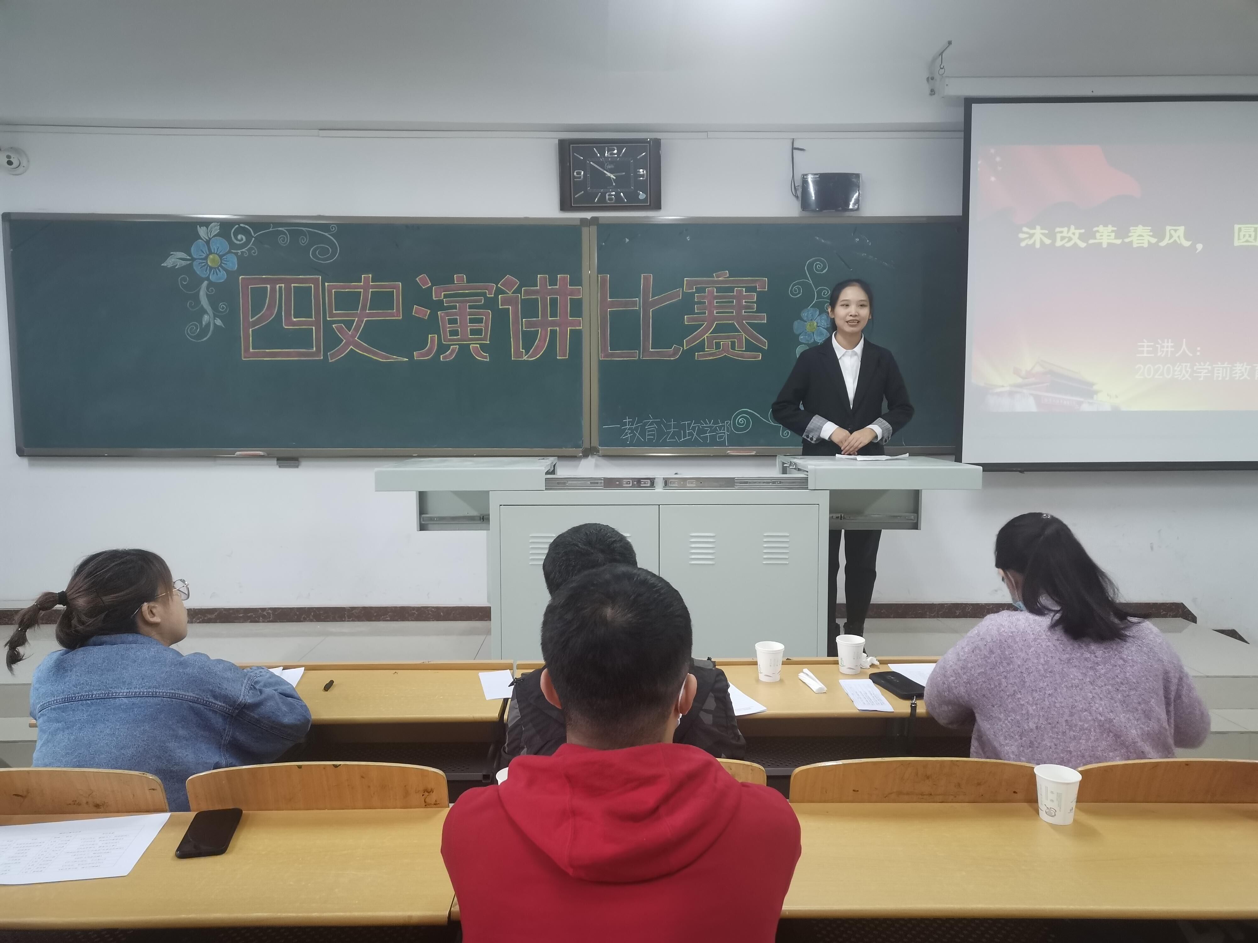 教育法政学部举办了 “学‘四史’鉴往知来,守初心接续奋斗”为主题的演讲比赛-缩小 放大+ 2020-11-2911月26日下午,教育法政学部于在第六教学楼605教室开展了“学‘四史’鉴往知来,守初心接续奋斗”为主题的演讲比赛,张振伟、贾枫、张星等三位老师参加本次活动。 参赛选手分别从以小见大的角度,透过革命前辈的故事,追忆峥嵘岁月;纵观中国历史的方式,从“难矣”往日,到繁荣新中国;联系疫情防控方面,展示中国责任担当等方式激情演绎对四史的理解、对初心的坚守、对使命的担当和对青春的认识。作为新时代的中国青年,应该振臂高呼:“此生无悔入华夏,来世还做中国人!”最后,评委张星老师对本次演讲大赛进行了总结点评,让选手们了解了自己的优点与不足,也激励着他们向更优秀的方向前进。 本次演讲比赛为同学们提供了一个展示自我才华的平台;同时为同学们深入学习“四史”提供了与众不同的学习方式,帮助同学们从历史中汲取经验智慧,从历史中感悟时代使命。加强了学部学风的建设,丰富了校园精神文化生活,成功营造积极向上的校园氛围。