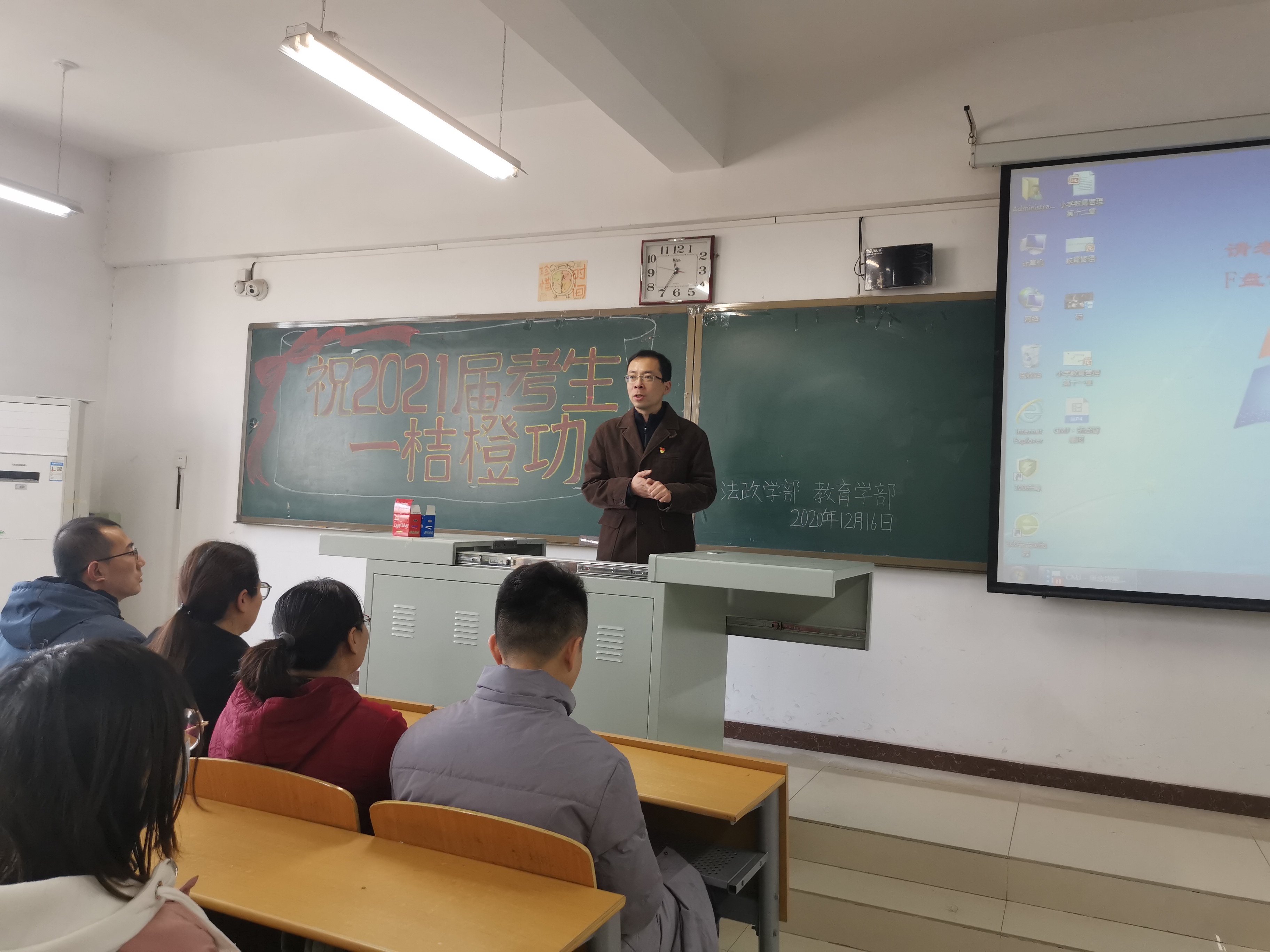 教育法政学部举办“一桔橙功”考研送祝福活动-缩小 放大+ 2020-12-1712月16日,教育法政学部在第六教学楼404教室开展了以“祝2021届考生一桔橙功”为主题的为考研学生送祝福活动。活动由团总支书记张振伟主持,教育法政学部部长徐鹏、学生工作副部长张娜、教学工作副部长王瑜、毕业班辅导员张子君、孙超参加本次活动。