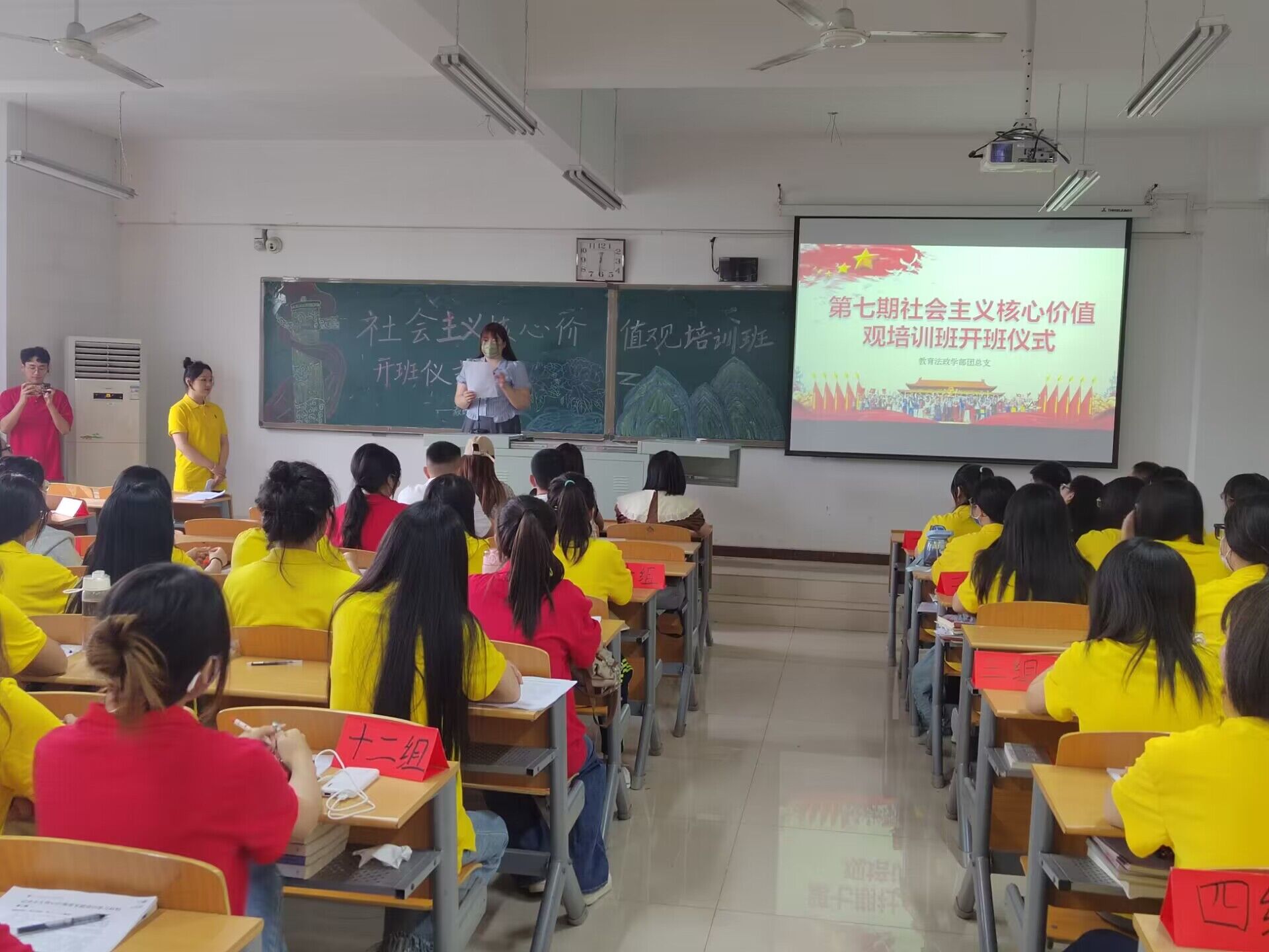 “第七期社会主义核心价值观培训班”开班仪式圆满结束-缩小 放大+ 2023-05-305月26日,由教育法政学部团总支组织的第七期社会主义核心价值观培训班在第六教学楼504教室举办。 活动第一项内容是团总支代表张可发言,介绍了本次培训活动基本流程,阐述了本期培训活动的培训主题,为首次参与培训的学员明晰了活动大体方向,加深对本次培训活动的理解和认知。活动第二项内容是教育法政学部团总支书记张振伟讲话,他围绕新时代党和国家的方针和政策深入解释了社会主义核心价值观对于当今社会的意义以及对于当代大学生的意义,切合实际,切入要点,贴近青年,具有深刻教育和指导意义。活动第三项内容是观看并学习习近平总书记对于青年的寄语。“青年强,则国家强”习总书记的话语声声入耳,激励当代青年不负青春,不负华年,敢于肩负历史使命,为实现中华民族伟大复兴的中国梦而奋斗。各学习小组结合学习材料第一篇内容积极讨论,准备发言,各学习小组的感受良多,受益匪浅,深入体会习总书记寄语,并与青年自身发展高度结合。