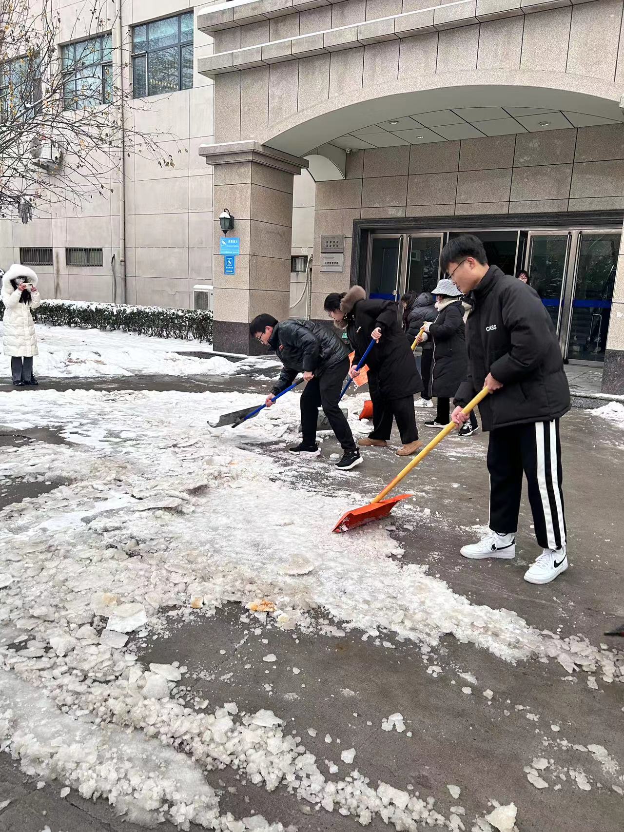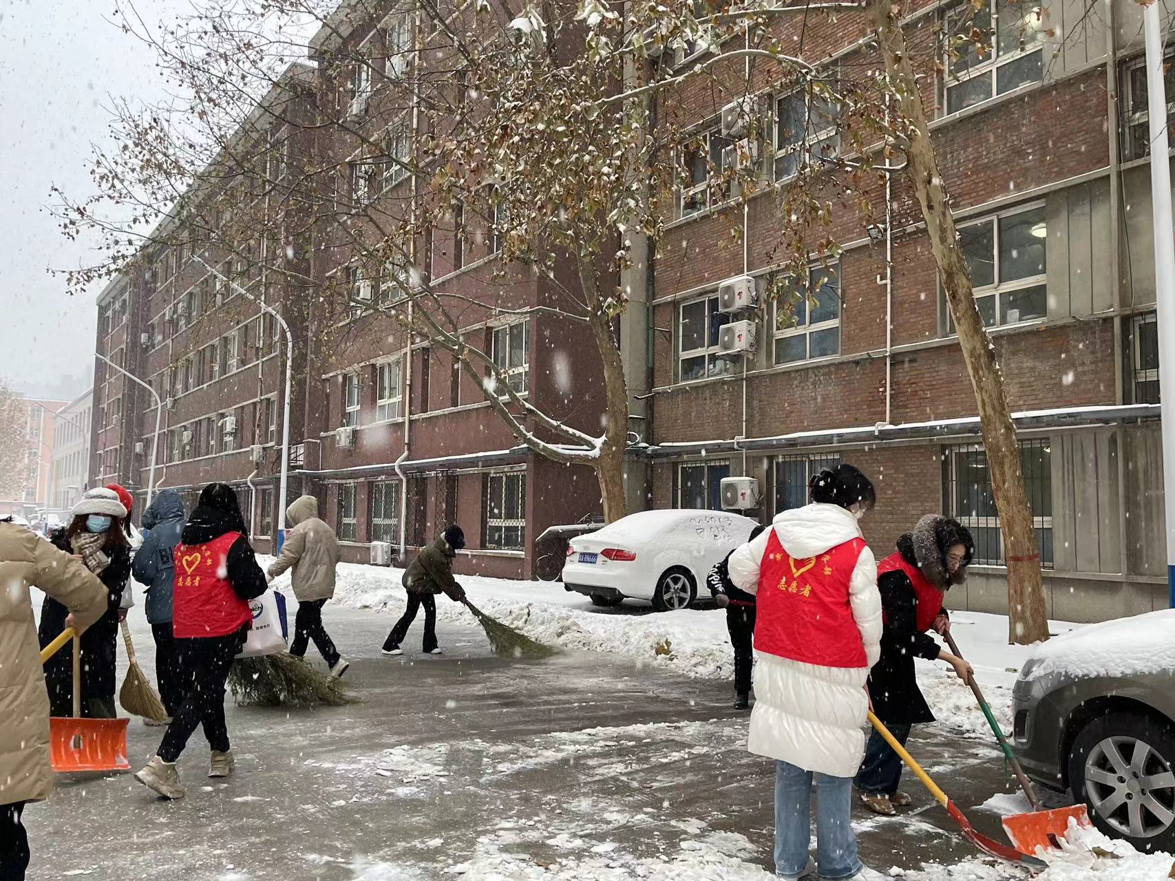 扫雪志愿行,温情暖人心。在除雪活动中,志愿者们充分发扬不怕苦、不怕累的精神,他们拿起扫帚、雪锹等扫雪工具,有条不紊地清扫食堂门前及学院关键道路上的积雪。虽然志愿者们的手和脸冻的通红,但却丝毫没有影响大家扫雪除冰的热情和工作效率。他们冲在前、干在先、战严寒、斗冰雪,分工有序,干得热火朝天,在道路上演奏着扫雪除冰“进行曲”。志愿者们忙碌的身影在冬天凛冽的寒风中构成了一道靓丽的风景线。经过两个多小时的奋战,学院道路的积雪基本清扫干净,为师生出行开辟了“绿色通道”。