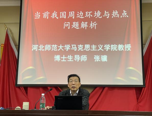张骥教授以其深厚的学术底蕴和独到的见解,为在场师生带来了一场内容丰富、思想深刻的学术盛宴。他围绕当前我国周边环境与国际热点问题,从国际形势总体特点、中国周边环境面临的新形势与国际热点问题以及当前几个热点问题的具体分析等三个方面进行了深入阐述。 讲座中,张教授首先深入分析了当前国际形势的总体特点,并详细讲解了“百年未有之大变局”这一命题的提出背景、五大表现以及群体性崛起的态势。他结合案例,剖析了当前国际形势的复杂性和多变性,使在场师生对这一时代特征有了更为深刻的理解。随后,张教授对中国周边环境面临的新形势与国际热点问题进行了剖析。他结合中国与周边大国的国际关系发展现状和未来趋势,深入讲解了当前国际环境中中国所面临的挑战与机遇。同时,他还对当前几个热点问题进行了具体分析,为同学们开阔了视野,提供了思考路径。