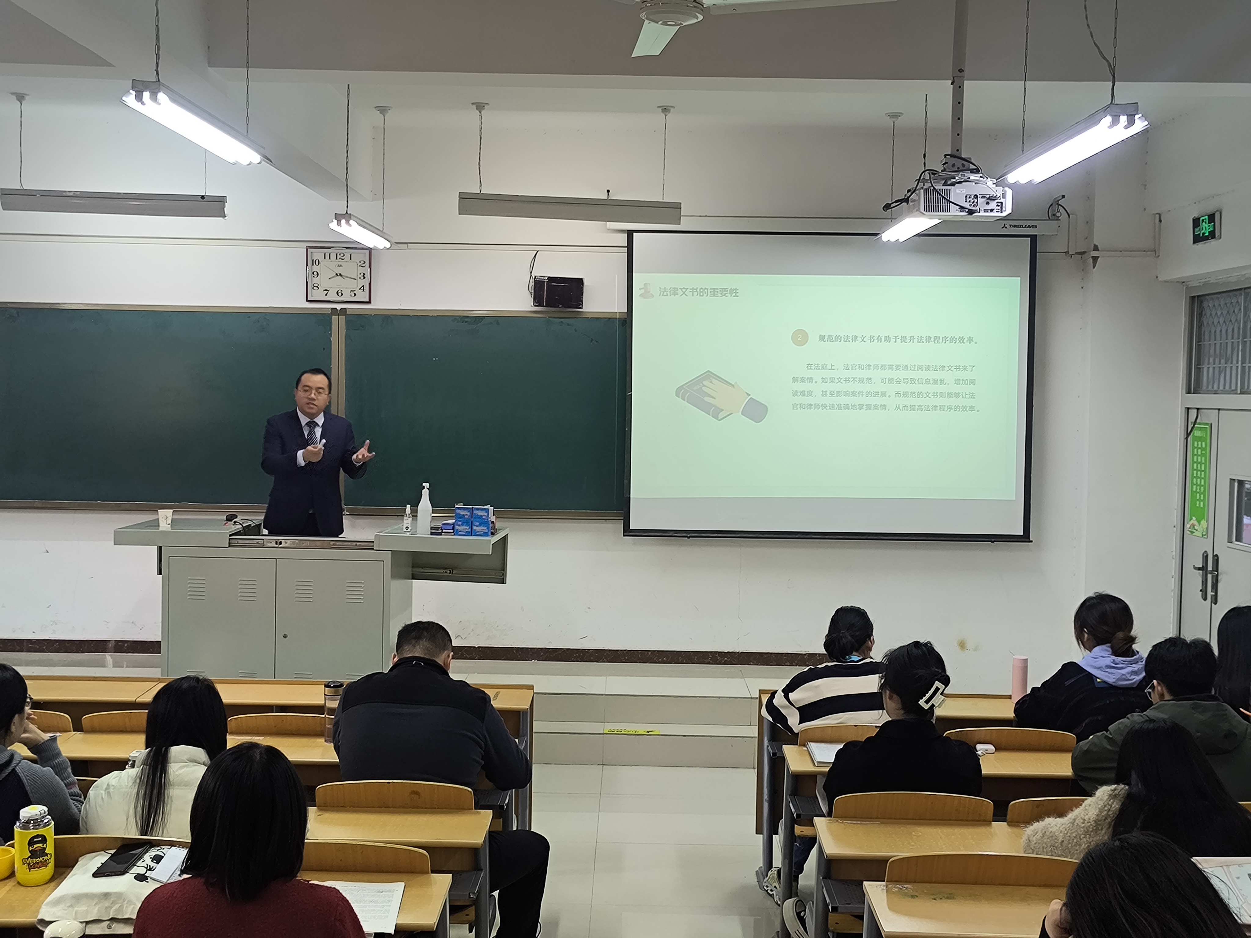 法政学部举行“双师同育,赋能增长”律师进课堂系列活动第四讲-缩小 放大+ 2024-11-0611月5日上午,法政学部邀请到河北冀华律师事务所高级合伙人钱程律师,为2022级法学专业的同学们带来了一场以“法律文书写作”为主题的讲座。 在讲座中,钱程律师从法律文书的重要性、如何写好法律文书以及法律案例分析三个方面对法律文书写作相关问题进行了深入解读。他用自己经办的案件、书写的法律文书给法学专业的同学们呈现了清晰、简洁、精准、具有很强说服力的法律文书是怎样炼成的。钱程律师特别指出法律文书的书写要注意事实和法律的结合,一份成功的法律文书要兼具“形”和“神”,作为法学生要不断提升对法律的敏感度,勤于思考,不断积累。 通过这次讲座,同学们进一步认识到法律文书对于法律程序的重要意义,纷纷表示以后要学好法律专业知识,提升文字能力,不断提高法律文书写作水平,为将来从事法律职业打下坚实的基础。