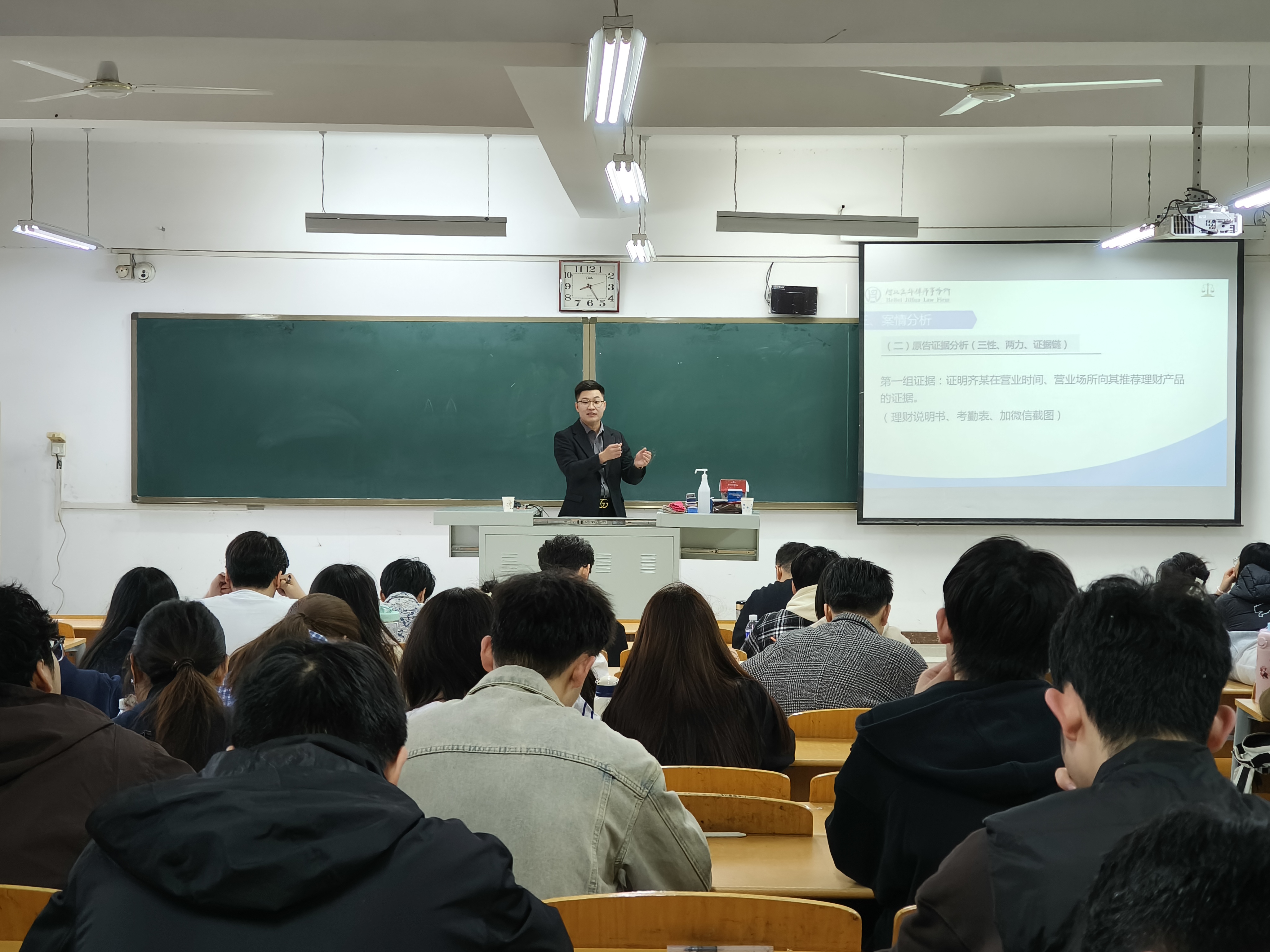 在讲座中,卢鹏鹏律师精选了一起具有代表性的理财产品纠纷案件,从案情简介,案例分析,事实呈现等方面展开,并对证据使用的要素,以及案例的证据分析与组织等方面进行了详细的讲解。此次讲座为学生提供了一个实际案例中证据应用的指导,帮助他们理解在实际案件中如何准确、全面地呈现事实,评估证据的可信度,并构建有说服力的证据链。讲座期间,卢鹏鹏律师还与在场学生进行了积极的互动交流,为同学们解疑释惑。卢律师根据自己丰富的工作经验耐心的回答了同学们关于职业选择,案源开拓等法学专业实际发展方面的问题,针对不同发展路径给同学们提出了针对性的指导建议。同学们纷纷表示,通过本次讲座,他们对法律实务有了更加清晰的认识,特别是在证据的应用和组织方面,为他们未来的法律职业生涯打下坚实的基础。 阅读次数:1929