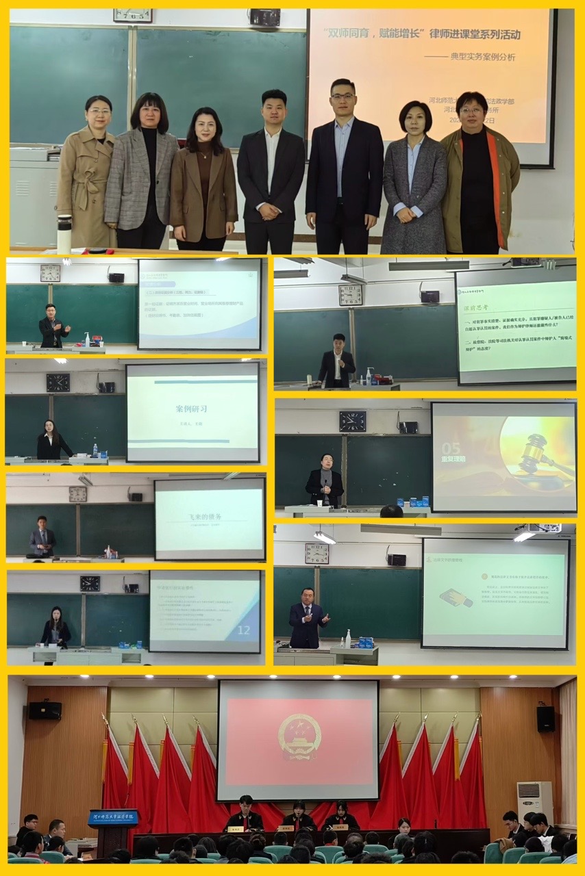 法政学部积极探索构建法学专业特色课程-缩小 放大+ 2024-12-11为全面落实中共中央办公厅、国务院办公厅发布的《关于加强新时代法学教育和法学理论研究的意见》,法政学部积极推动产教融合,拓展校外资源,深化法学专业的实践教学。本学期,学部加强与河北冀华律师事务所的合作,邀请该所实务经验丰富且具有较高理论素养的资深律师走进课堂,双师同育,赋能增长,在法学专业人才培养方案中,积极探索构建《典型实务案例分析》特色课程,聘任8位律师为实务导师,为2022级法学专业学生授课。通过课程构建的有益尝试和创新探索,让学生近距离接触行业律师,思考分析真实的法律案例,进一步提升了学生的法律思维和实务操作技能,为未来的职业生涯奠定了坚实基础。 10月22日,马晓阳律师为学生们带来了课程的第一讲《认罪认罚案件如何做好辩护工作——以代理的一起诈骗罪案件为例》。马律师通过案情梳理、辩护过程、案例演示等方面,详细讲解了案例的定罪、量刑、辩护思路等,为学生提供了一个实际案例分析的框架,提高了学生的法律分析能力、批判性思维和专业素养。 10月29日,王浩律师以《飞来的债务》为题带来课程第二讲,他精选了一起具有代表性的民间借贷案件,从案件的基本情况、深入分析到可能的法律延伸,全方位地为学生们揭示了案件的复杂性和法律的实践应用。 10月30日,张凤律师以《交通事故赔偿》为题,就一起具有代表性的交通事故赔偿案例进行详细的案情分析,系统讲解了与交通事故赔偿相关的法律问题,包括起诉顺序,伤残鉴定,理赔等方面。 11月5日,钱程律师讲授了《法律文书写作》,从法律文书的重要性、如何写好法律文书以及法律案例分析三个方面对法律文书写作相关问题进行了深入解读,还特别指出法律文书的书写注意事项,鼓励学生要不断提升对法律的敏感度,勤于思考,不断积累。 11月6日,马洁律师结合自身办案实战经验,从执行的原则、执行管辖的一般规定、执行的申请与受理和执行的要件等方面就执行制度的相关问题进行了深入浅出的阐述。援引大量案例,系统性地讲解了执行过程中当事人的确定、变更和追加,以及执行和解、中止执行等问题。通过具体案例,生动展现了在执行实践中如何灵活运用法律手段切实保障合法权益。 11月12日,卢鹏鹏律师讲授了《从一则真实案例看民事诉讼证据的组合运用》。通过对一起理财产品纠纷案件的分析,详细讲解了关于证据使用的要素,案例的证据分析与组织等法律实务知识,帮助学生理解在实际案件中如何准确、全面地呈现事实,评估证据的可信度,并构建有说服力的证据链。 11月13日,王萌律师以一宗涉嫌故意伤害罪的刑事案件作为研讨对象,从案件概况、关键法律知识点、实务操作经验等多个维度进行深入剖析,对刑事案件所涉相关法律条文、量刑准则等进行了详尽阐释,为学生们提供了实务指导。 每讲结束后,资深律师还与在场学生进行了积极的互动交流,针对同学们关于“考公”“考研”“考证”等专业发展和规划方面的问题给予了指导性建议。 12月3日,在第十一个国家宪法日到来前夕,学部联合河北冀华律师事务所在图书馆报告厅成功举办模拟法庭活动。河北冀华律师事务所高级合伙人、管委会副主任商杰携张凤、刘鹏、王浩4位资深律师出席并进行点评指导。商杰律师还结合国家宪法日对我国宪法相关内容进行宣讲。本次课中,学生们“沉浸式”体验了庭审现场,将所学的法律理论知识应用于实际案例,加深了对法律条文和司法程序的理解,更直观地感受到法律的权威,增强了法律职业的责任感和使命感。 多年来,法政学部致力于人才培养模式的革新与突破,积极探索产教深度融合的育人新路径。构建《典型实务案例分析》这一课程,不仅为学生搭建了理论与实践相结合的平台,而且为培养具有深厚理论基础和精湛实务技能的优秀法治人才打下了坚实基础。8位资深律师与校内教师共同组建了一个优势互补、资源共享的双师型教学团队,也进一步提升了教学的实践性和专业性。学部将持续探索和改革人才培养模式,努力提升育人质量,为莘莘学子架设通往未来职业发展的宽广道路。