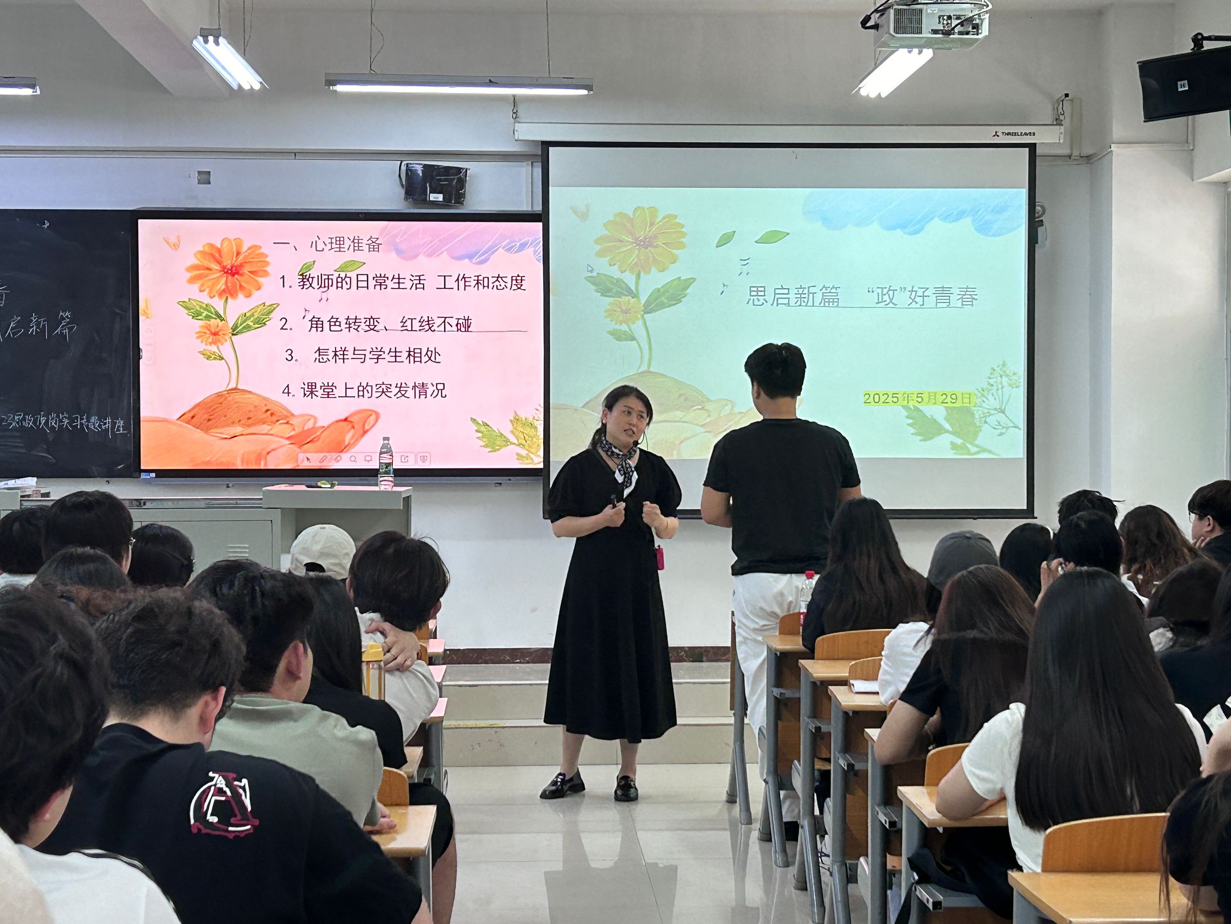 【基础教育名师讲堂】法政学部举办“政好青春 思启新篇”顶岗实习专题讲座-缩小 放大+ 2025-06-03为提升思想政治教育专业学生教育教学能力,助力其高质量完成顶岗实习工作,法政学部于5月29日在6教305教室举办“政好青春 思启新篇”顶岗实习专题讲座。Beat365唯一官方网站附属实验中学政治教研组组长、中学高级教师刘金凤应邀担任主讲嘉宾,为2023级思想政治教育专业全体学生带来兼具理论高度与实践深度的专业指导。 讲座聚焦“课堂教学组织策略”与“思政课备课方法论”两大核心议题展开。在课堂教学组织方面,刘老师紧密围绕习近平总书记“广大教师要做学生锤炼品格、学习知识、创新思维、奉献祖国的引路人”的重要指示精神,从心理准备、角色转变、物质准备三个维度进行深入剖析。在心理准备层面,她提醒同学们在实习期间要端正态度,以高度的责任感和积极进取的精神迎接各项挑战,强化职业认同感与使命感;在角色转变方面,着重强调要牢记习近平总书记对教师“为党育人、为国育才”的初心使命要求,坚守师德底线,不触碰师德红线,以高尚的师德风范引领学生成长,用心关爱每一位学生,以真诚的爱心和强烈的责任感建立良好的师生关系,为教育教学工作的顺利开展奠定坚实基础;在物质准备环节,明确指出《课程标准》是教学的纲领性文件,全套教材是落实立德树人根本任务的重要载体,建议同学们提前熟悉并深入钻研,为教学实践筑牢根基。 针对“如何准备一堂思政课”,刘老师从理论与实践两个维度进行了全面剖析。在理论层面,她紧扣习近平总书记在学校思想政治理论课教师座谈会上的重要讲话精神,深刻阐释了思政课作为关键课程的重要地位,强调教师要用心用情给学生心灵埋下真善美的种子,引导学生扣好人生第一粒扣子。在实践层面,她通过具体课例展示,生动呈现了优质思政课的设计思路与教学过程,为同学们提供了可借鉴、可操作的实践范例。 讲座期间,同学们全神贯注、认真记录,并积极参与互动交流,就实习与教学过程中可能遇到的问题踊跃提问。刘老师凭借丰富的经验和深厚的学识,耐心细致地解答了同学们的疑问,现场气氛热烈而融洽。