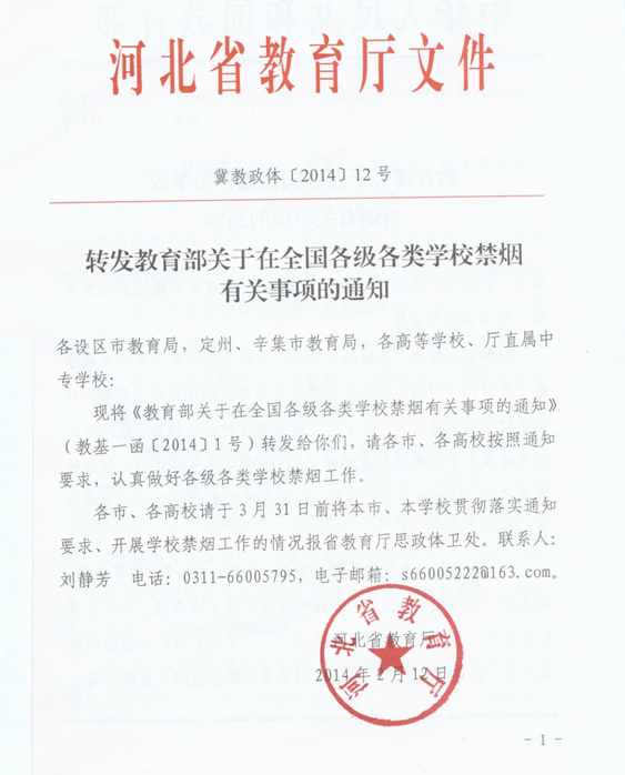 关于转发河北省教育厅《转发教育部关于在全国各级各类学校禁烟有关事项的通知》的通知