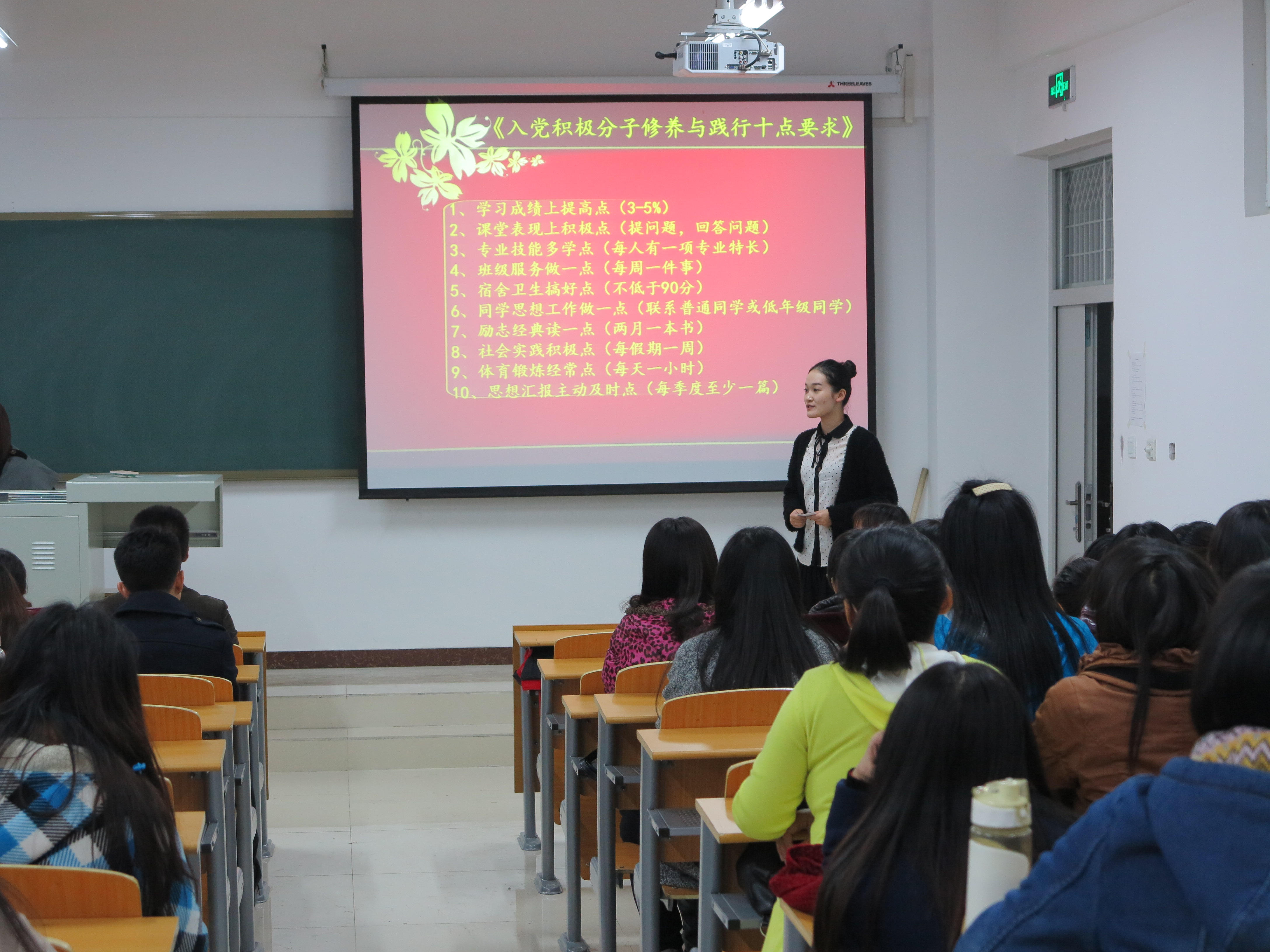 11月7日晚,教育(法政)学部党总支在北院六教301教室举办了“优秀党员事迹汇报暨积极分子践行十项新规”学习会,学部全体教工党员、学生党员代表和积极分子代表百余人参加了会议。 学习会首先由毕业班优秀学生党员王瑞琪、郑静进行事迹汇报。王瑞琪用平实朴素的语言介绍了自己在思想、工作、学习、生活等方面如何发挥党员的先锋模范作用,号召广大学生党员、积极分子从做好学生的本职入手,力求精益求精,处处争做先锋模范。郑静结合习近平总书记五四青年节在北师大的讲话中对青年大学生“勤学、修德、明辨、笃实”四点要求,讲述了自己成为一名优秀的大学生、一名优秀的共产党员的奋斗历程,号召大家严格要求自己,刻苦学习,积极参与各种活动,热心为广大同学服务,在奋斗与奉献中获得成长。 学习会的第二项内容是与会积极分子一起学习《教育(法政)学部入党积极分子修养与践行十项新规》。“十项新规”作为学部党的群众路线教育实践活动制度成果之一,在积极分子培养上进行了创新,对积极分子做出了细化要求:学习成绩上提高点(3-5%)、课堂表现上积极点(提问题,回答问题)、专业技能多学点(每人有一项专业特长)、班级服务做一点(每周一件事)、宿舍卫生搞好点(不低于90分)、同学思想工作做一点(联系普通同学或低年级同学)、励志经典读一点(两月一本书)、社会实践积极点(每假期一周)、体育锻炼经常点(每天一小时)、思想汇报主动及时点(每季度至少一篇)。用十条切实可行、操作性强的量化措施来引导促进积极分子向党组织靠拢。 学部党总支组织委员、副部长张娜对本次学习会进行了总结,她希望同学们从优秀党员先进事迹中领悟出是“什么是合格(优秀)共产党员,怎样成为一名合格(优秀)共产党员”,强调入党积极分子要时刻严格要求自己,从自身做起,从小事做起,从点滴做起,切实在生活学习工作中落实“十项新规”,在各方面起到模范带头作用,不仅做到组织上入党,更要做到思想上入党、行动上入党。 本次学习会是学部党总支“践行党的群众路线,展积极分子风采”系列活动的重要组成部分,今后还要举办党员(积极分子)学习沙龙、积极分子风采展示汇报会等来巩固和检验教育实践活动成果。 阅读次数:29648