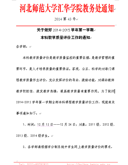 关于做好2014-2015学年第一学期本科教学质量评价工作的通知