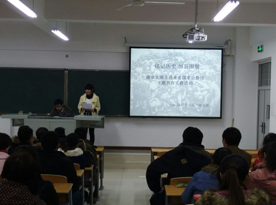 12月18日,法政学部在北院第五教学楼302教室举办“铭记历史 心系国家”为主题的“南京大屠杀国家公祭日”教育活动暨党员宣誓仪式,学部党总支组织委员、学生工作副部长张娜,总支纪律委员、教学工作副部长王瑜,各支部书记及本年度新发展的学生党员参加了活动。 12月13日是第一个国家公祭日,为了铭记日本侵华战争给我国人民造成的深重灾难,深入学习领会习近平总书记公祭日重要讲话精神,培养青年党员的爱国主义精神,传递“铭记历史 心系国家”的正能量,学部党总支认真组织、策划开展了此次教育活动。首先,由学生党员代表通过ppt带领师生回顾了那段不能忘却的历史,深入学习领会习近平总书记重要讲话精神。触目惊心的文字、图片和史料事实控诉着日本法西斯的侵略罪行,全体党员深受教育和触动。习总书记的重要讲话,宣示了中国人民牢记历史、不忘过去、珍爱和平、开创未来的坚定立场,同时也让与会党员深刻理解设立国家公祭日的时代意义。随后,党总支组织年度发展的新党员进行了庄严的入党宣誓仪式,以此教育大家时刻牢记党的宗旨、勿忘国耻、振兴中华。张娜在仪式上进行了总结发言,她强调,作为青年党员要牢记历史的耻辱,要珍惜现在的和平生活,以史为鉴,勤奋学习,肩负起历史使命,将爱国内化到心灵深处,将爱国融入自己的日常行为中。活动最后,与会党员共同观看纪录片《1937南京记忆》,重温了那段令人刻骨铭心的历史。 本次国家公祭日主题教育活动,让与会党员真正了解了“南京大屠杀”中日本侵略者对中国人民所犯下的滔天罪行,激励着青年党员牢记历史,勿忘国耻,肩负起振兴中华民族的重任,从自身做起,奋发图强,为早日实现中华民族伟大复兴的中国梦而努力奋斗! 阅读次数:29696