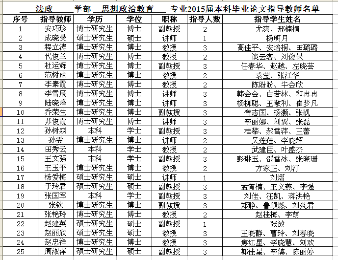 法政学部思想政治教育专业2015届本科毕业论文指导教师名单