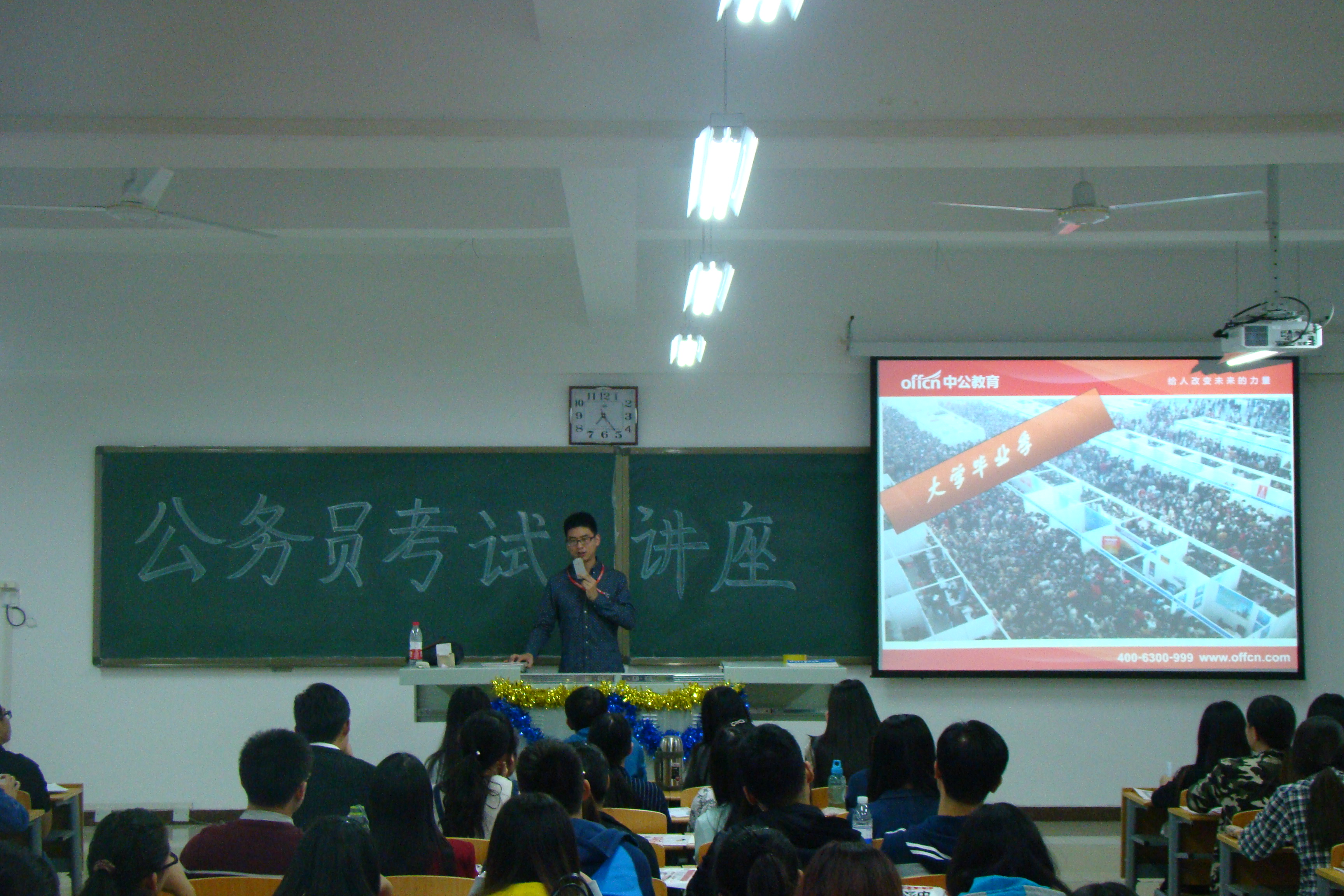 “给梦想一双翅膀” ——教育法政学部2015年公务员考试备考讲座圆满落幕-缩小 放大+ 2015-10-15为了增强广大学生对公务员考试的认识,提高专业素质,教育法政学部于10月13日晚在北院第六教学楼504教室举办了“给梦想一双翅膀”公务员备考讲座。本次讲座有幸邀请到了中公教育著名讲师刘猛,近200名学生聆听此次讲座。 讲座开始时,刘老师直奔主题,分析了当前考试的形势,帮助同学们认清当下环境,树立科学的公务员备考理念。刘老师就自己多年的经验给出了很多具体有用的实战技巧,妙语连珠,幽默亲切,把枯燥的考试讲解的绘声绘色,特别是对于申论写作,他用生动的案例将此项考试的要点难点做了清晰的说明,同学们听得也是津津有味。本次讲座围绕公务员考试公告解读,考试流程和备考策略三个方面,进行深刻、系统、精彩的讲解,完善细致的讲授引得在场学生的阵阵掌声。 此次讲座不仅使同学们对国家公务员考试有了更深的了解,增强了备考信心、掌握考试技巧、明确就业方向,营造了良好的学习氛围,有效推进了学部的专业建设、专业应用,拓宽了学生的就业的能力和就业水平。今后学部会继续加强专业分类指导,举办更多有利于培养学生专业水平,促进学生更好就业的活动,帮助他们明确职业目标,不断提升就业竞争力。