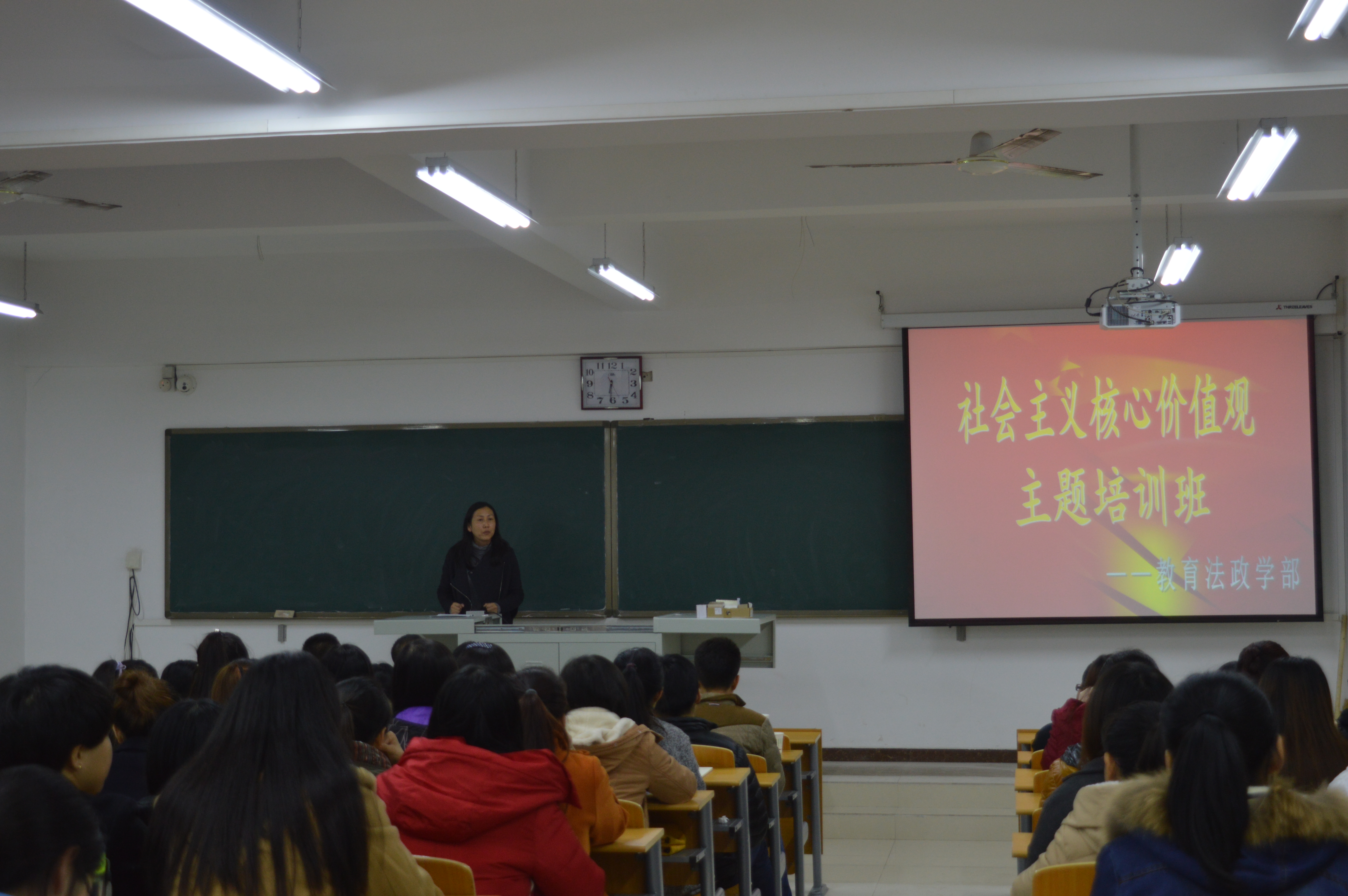 教育法政学部社会主义核心价值观专题培训班正式开班-缩小 放大+ 2015-11-1211月10日,教育法政学部以培育和践行社会主义核心价值观为主题的培训班开班仪式在第六教学楼303教室举行,学部部长周桂英、副部长张娜,各年级辅导员老师及培训班一百余名学生参加了本次活动。 周桂英在开班仪式上做了动员讲话,她要求全体同学要充分认识这次培训班的重要意义,要在思想上高度重视,深刻理解领会社会主义核心价值观的内涵,鼓励广大学生不辱青年肩负的历史使命,加强自身的思想修养,积极践行社会主义核心价值观;要自觉遵守培训班的相关要求,树立模范带头作用,不断锤炼、不断进取,学有所获;要积极践行社会主义核心价值观,把学到的东西内化于心外化于行,用自己的实际行动为身边同学做出榜样,为社会做出贡献。随后,全体学生观看了由中央宣传部学习出版社、中央电视台联合拍摄的系列片《百年潮中国梦》,让在场同学通过回顾近代中国历史进程,坚定践行核心价值观、实现中国梦的伟大理想和追求。 社会主义核心价值观专题培训班是学部为进一步贯彻落实党的十八大和十八届五中全会精神,培育青年学生践行核心价值观的重要举措,培训班将以社会主义核心价值观为核心,通过学习、讨论、宣传、践行四个步骤来达到教育效果。活动的开展将对进一步推进新时期社会主义核心价值观建设,强化对青年学生意识形态的高势位引导,推进德育教育工作的开展起到积极作用。