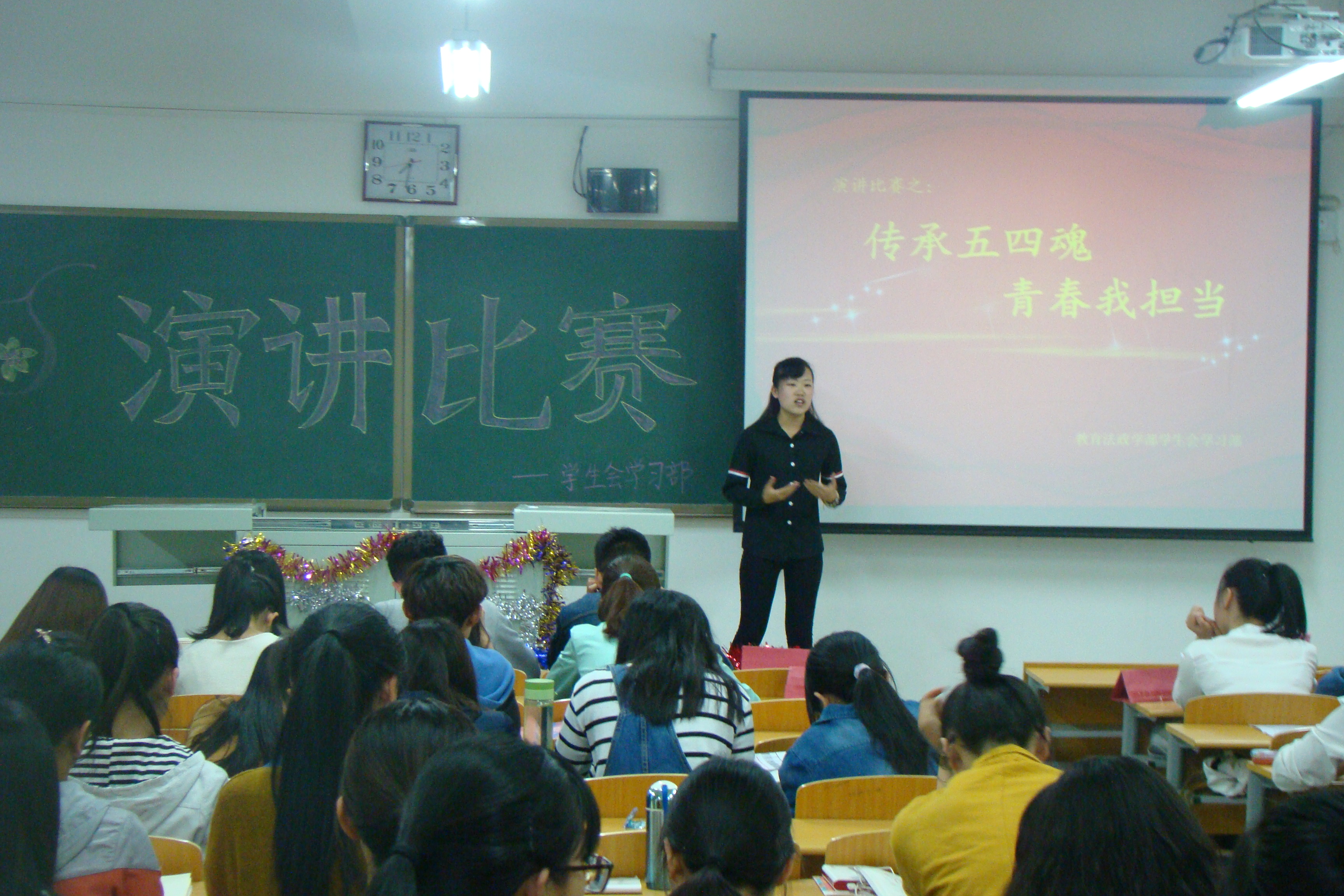 “传承五四魂,青春我担当”教育法政学部迎五四系列活动蓬勃开展-缩小 放大+ 2016-04-21在五四青年节即将到来之际,4月19日晚,教育法政学部在第六教学楼403教室举办了以“传承五四魂,青春我担当“为主题的演讲比赛,来自 2014级和2015级部分学生观看了本次活动。 经过层层选拔,共有10名选手进入最终的决赛。比赛中,选手们的演讲或高亢激昂,充满力量,或细腻婉转,满怀深情。什么是“五四精神”,来自2014级小学教育专业王静,结合自己的大学生活,告诉大家把握大学时光,不断超越自我就是“五四精神”的最好的诠释延续;2014级法学专业王馨语,结合近代历史进程向大家阐述提高自我,不断奉献就是“五四精神”在当代的最好体现。其他选手们也从各自的角度,用富有感染力的现场表现,向在场观众生动的阐述了“爱国、进步、民主、科学”的五四内涵,让大家对五四精神有了更多的认识和理解,选手们的精彩表现赢得现场观众的阵阵掌声。最终,来自2014级学前教育专业的王田田获得了本次比赛的第一名。 青年最富有朝气、最富有梦想,青年兴则国家兴,青年强则国家强。本次演讲比赛是教育法政学部迎五四系列活动的开端,活动以牢牢把握“重温五四,铭记历史,开创未来”这条主线,通过演讲、摄影、征文、志愿服务等形式,将五四精神与时代要求紧密结合,意在让学生更加深刻了解五四精神的内涵,鼓励学生不断坚定理想信念,不断练就过硬本领,追求卓越,勇于创新,在实现中国梦的生动实践中放飞青春梦想。