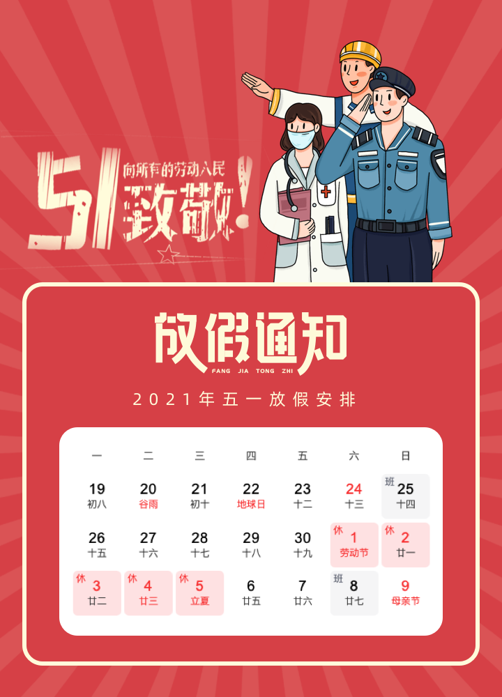 在假期来临之际,请各位家长提高安全意识,提前祝大家2021年劳动节快乐!