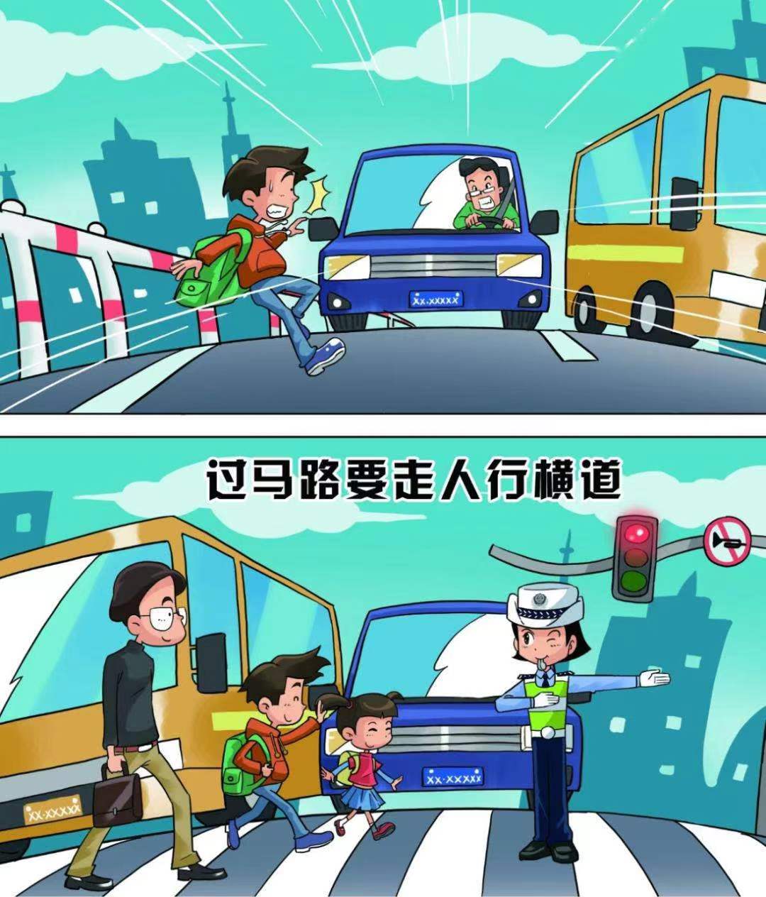 1.家长要教孩子认识各种交通信号和标志,“红灯停绿灯行”,告诉他们横过马路,一定要走斑马线,不要在马路上玩耍打闹。当然,日常生活中家长也要为孩子做好榜样,不随意带着孩子闯红灯,要遵守交通规则!