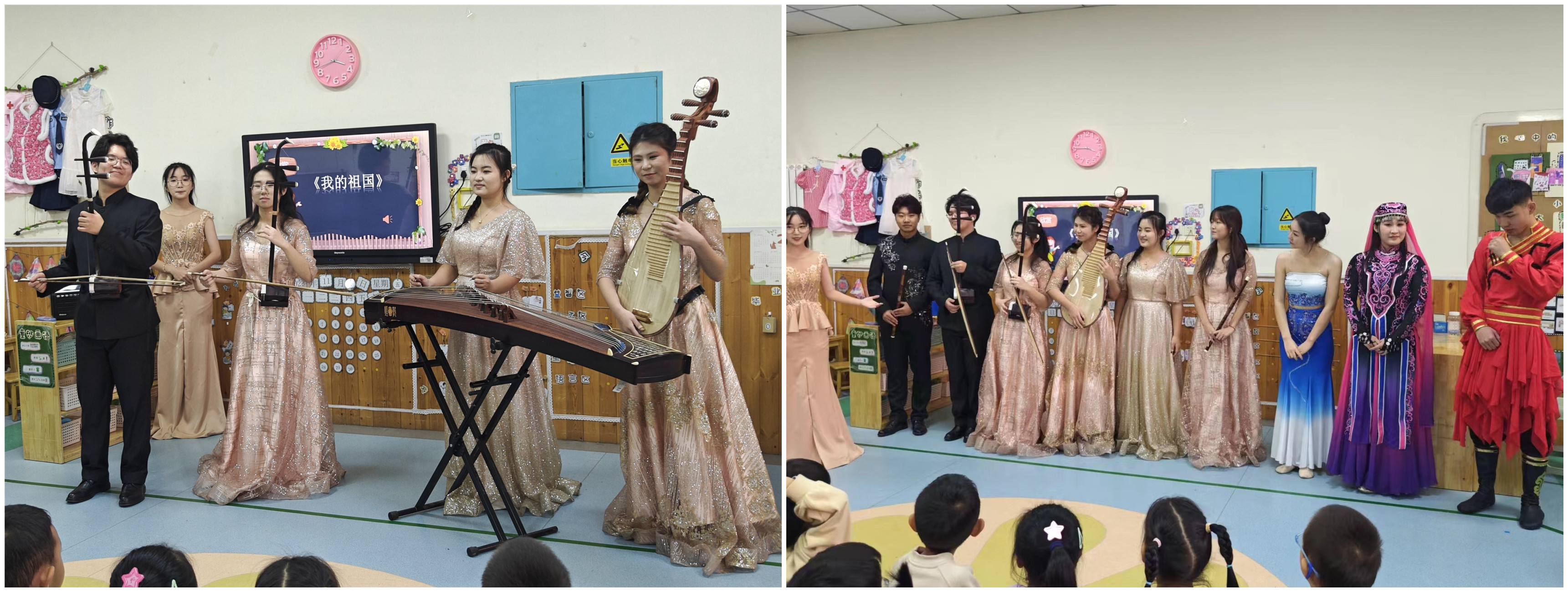 11月28日,艺术学部10名大学生志愿者到我园开展“艺术之光进校园”活动。大学生们身着盛装,为大班的小朋友们带来了一场视听盛宴。在富有民族特色的服装衬托下,他们展示了婀娜多姿的傣族舞,热情奔放的维吾尔族舞,稳健有力的蒙古族舞,让小朋友们对我国的少数民族和民族舞蹈产生了浓厚的兴趣。他们还用竹笛、二胡、琵琶、古筝等民族乐器演奏经典曲目。小朋友们听得全神贯注,掌声不断。最后,在大学生们的指导下,小朋友们尝试演奏各种乐器,学习典型的民族舞蹈动作。活动现场热闹非凡,直到活动结束,大家仍意犹未尽。