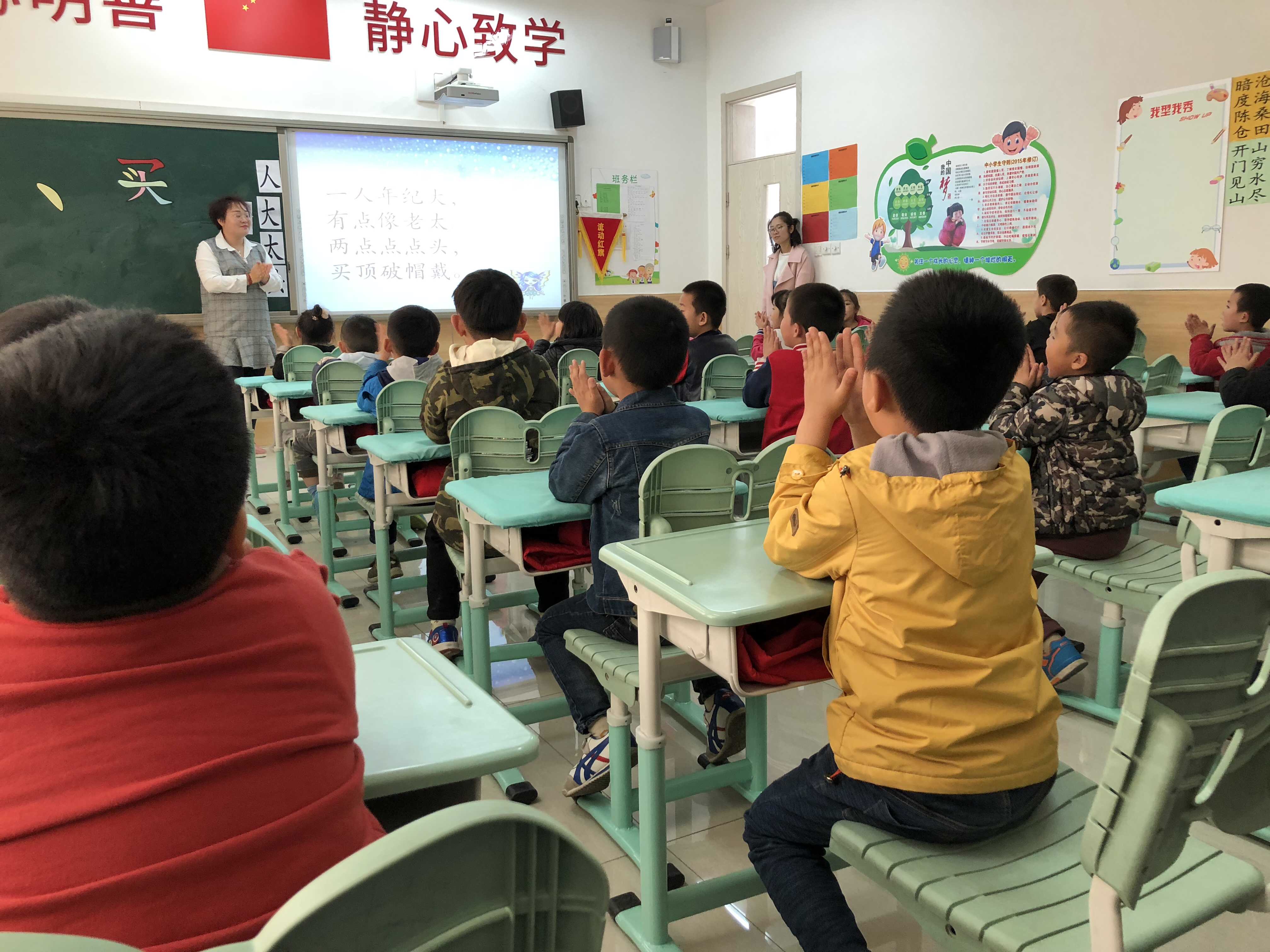 一年级的景老师,为我们大班小朋友,准备了一堂活泼生动的语文课,让孩子们零距离体验了一次做小学生的感觉。孩子们也学哥哥姐姐的样子端端正正地坐在椅子上,安安静静地注视和聆听,并积极举手回答问题。孩子们兴奋、积极、有序。
