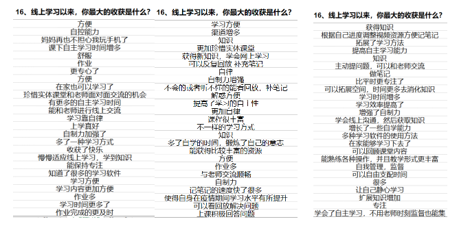 问卷主观题部分对于学生线上学习收获、最喜欢的课程和任课教师、建议改进的课程以及关于线上教学的意见建议进行了收集。