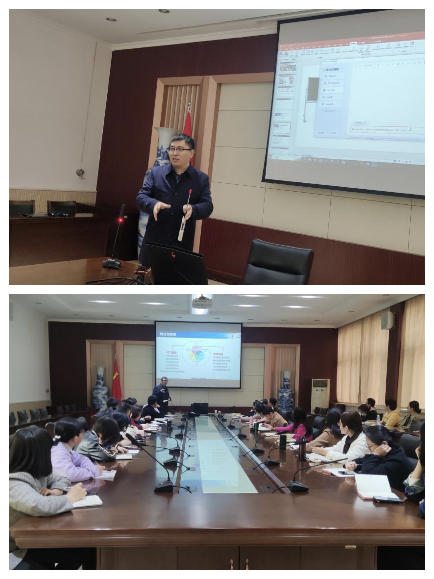 张增强结合自身丰富的数字化、智能化教学经验,从教师数字化素养的内涵及要求、AIGC时代各类平台的有效利用、指向性应用分类与总结归纳三个方面向老师们进行了详细介绍。他指出,培养教师的数字化素养是国家高等教育的重要战略,数字化素养也是新时代教师的核心素养之一。高校教师需要适应并利用数字化技术,培养学生应对人工智能快速发展挑战的创新能力。在讲座过程中,他利用雨课堂智能在线工具组织在场教师亲身体验智慧教学的各项功能,并使用讯飞星火、文心一言、Kimi、通义千问等人工智能大模型现场演示高效率高质量完成教学文档提炼、ppt生成、创意图片生成、3D教学模型构建等教学资料的应用场景。