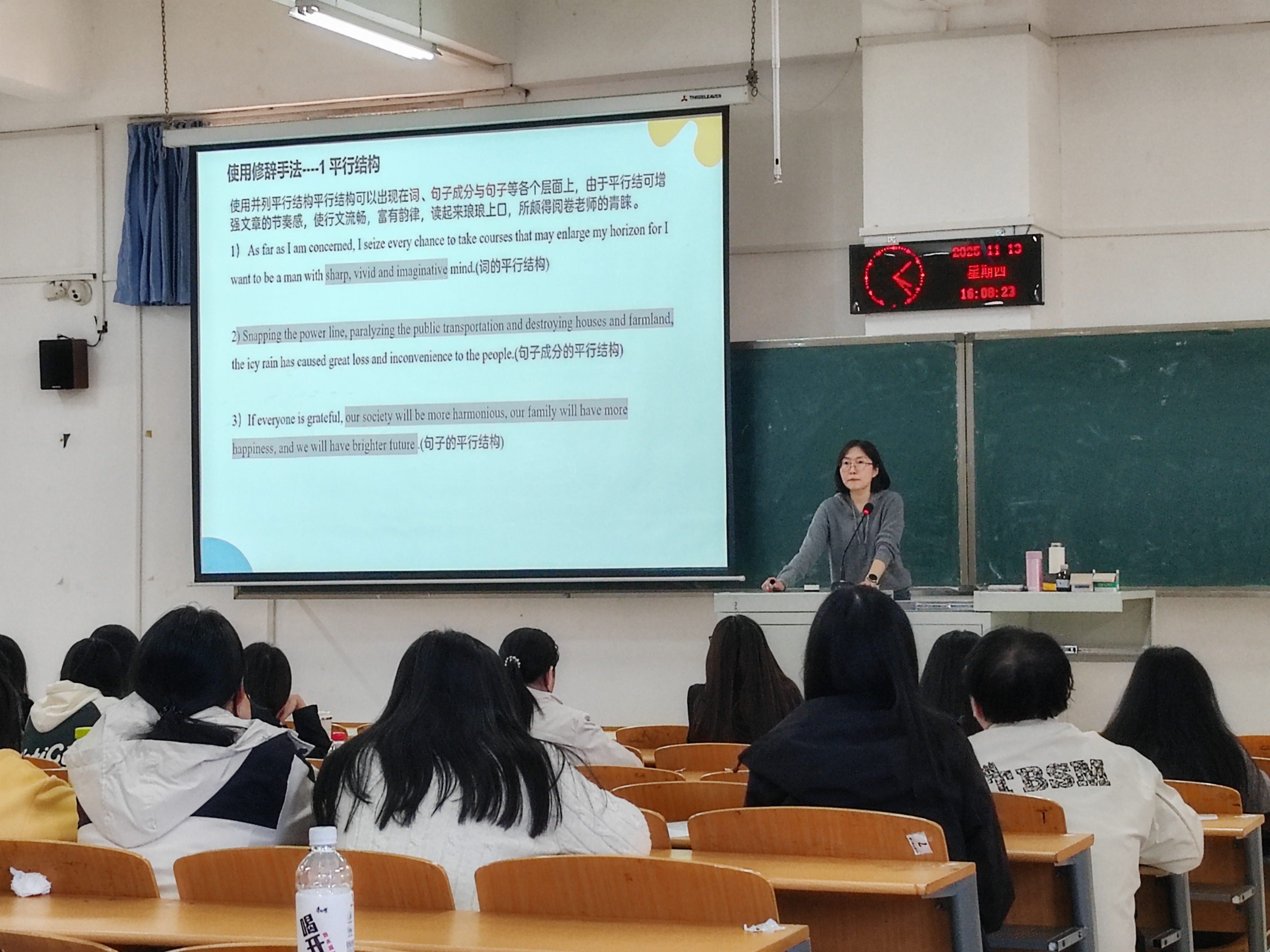 11月13日下午,第二场专题讲座由刘晓云老师主讲,此次讲座为翻译和写作备考方法与答题技巧专场。刘晓云老师围绕翻译与写作的核心得分点展开拆解:针对翻译模块,她重点讲解四大实用技巧——时态语态匹配,明确不同语境下的时态选择逻辑;从句辨别运用,通过长句拆分案例演示定语从句、状语从句的转换方法;专有名词规范,梳理文化类、专业类名词的标准译法;逻辑关系显性化,用转折、因果类连词补全中文隐含的逻辑。针对写作模块,她聚焦两大提分方向——格式规范,区分书信、议论文等不同文体的结构要求;特殊句式增色,举例说明倒装句、强调句在开头或结尾的运用技巧,全程结合真题示例与错误修正,让技巧可直接落地。现场学生表示,此次讲座精准解决了翻译“中式表达”、写作“平淡无亮点”等痛点,尤其是细分技巧的讲解,让备考思路更清晰。