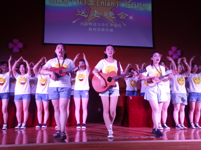 晚会开始前,一段来自低年级学生精心制作的视频,记录了从2012级学生踏入大学校门到即将毕业的过程,将他们在大学四年中的点点滴滴都呈现在荧幕上。随后,晚会正式开始,劲爆的开场舞,和歌曲串烧,让现场瞬间沸腾起来;相声《睡在我上铺的兄弟》以诙谐幽默的方式赢得在场观众的阵阵笑声;帅气高冷的模特秀《marry you》,诠释了从校园走向未来,从青涩走向成熟的历程,美丽女生和帅气男生把青春魅力全部释放出来,引来全场观众的欢呼;歌曲对唱《当我们》、爵士舞《hello kitty》、舞蹈《俏花旦》、《杯子歌》也用各自的方式展现了大学生活的多姿多彩;2012级学生张晴演唱的歌曲《那些花》满怀深情,在台上留下了感动的泪水,表达了对大学时光的回忆和不舍,让晚会的送别气氛更加浓厚;由毕业班师生带来的朗诵《会有那么一天》,歌曲《送别》、《干杯吧朋友》,展现了浓浓的师生情和不舍的离别意,让在场毕业生们不禁回想起大学四年中老师的教诲和恩情,每位老师上台时都得到观众们最热烈最真诚的掌声,这掌声是对老师辛勤工作的肯定,这掌声是对老师孜孜教诲的认可,这掌声更是对老师们深深的依恋和不舍。最后,来自2013级学前教育专业的李明用一首《有没有那么一首歌》带动了全场观众的热情,大家纷纷起立并点亮手机,跟随音乐一起唱出了这首最深情的祝福,所有的不舍、感激、祝福、憧憬和期盼都定格在了这最美好的瞬间。