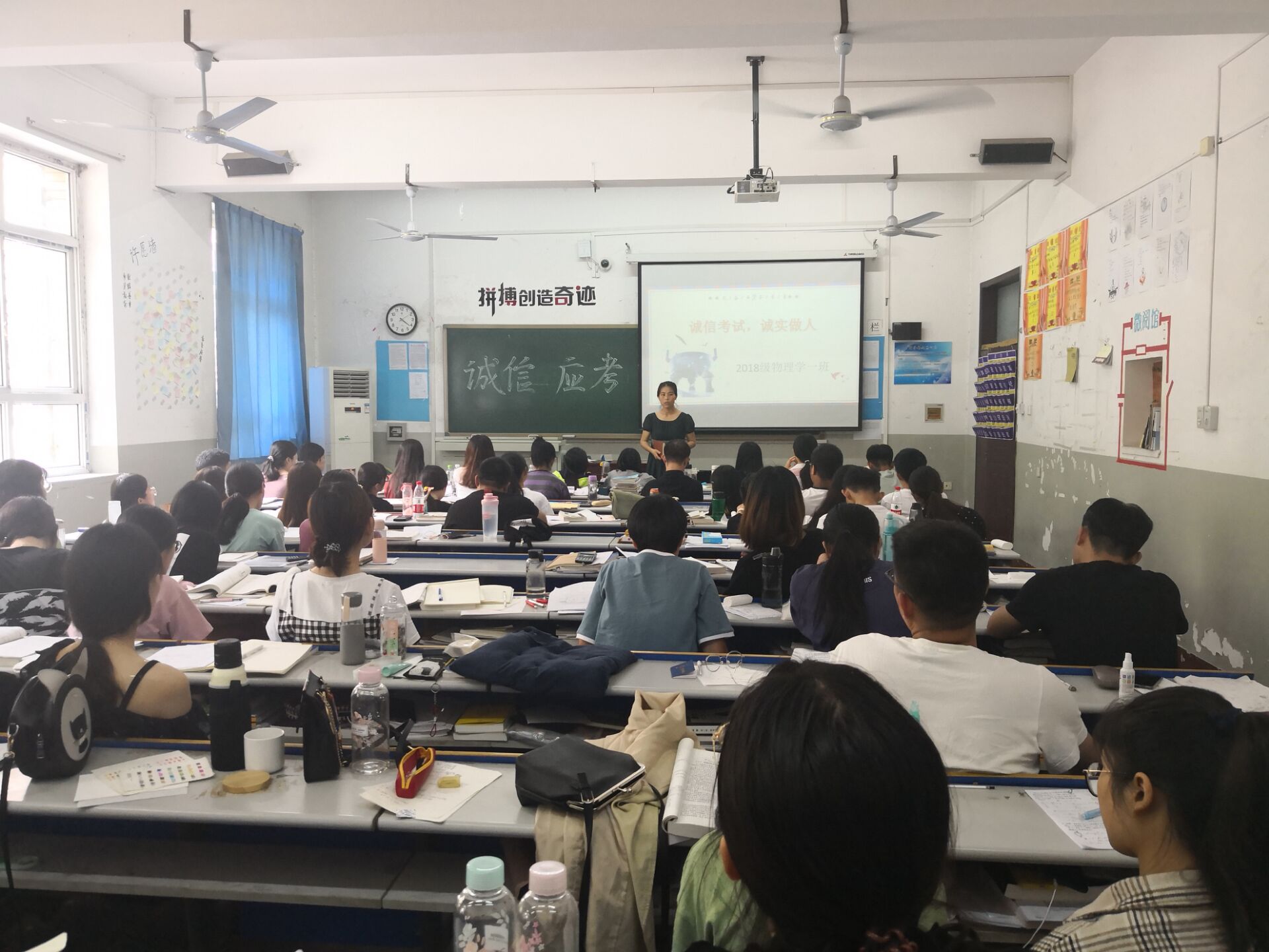 期末考试将至,为了培养同学们树立诚信考试之风,以积极向上的状态迎接期末考试。6月20日下午,2018级物理学1班在第二教学楼110教室开展“树诚信考风,做文明考生”主题班会。辅导员赵红菊老师及全体同学共同参加。 班会伊始,由班长组织同学学习考试纪律规章,让同学牢记考试规章,严格要求自己。随后观看有关视频,让同学们更加深刻的认识到考试作弊的危害性。最后辅导员赵老师总结要求同学们要端正学习与考试的态度,严格遵守考试规章制度,实事求是,杜绝一切考试作弊形式,坚决维护公平公正考试环境,发挥个人真实水平,倡导学院诚信之风。 此次班会,让同学们深刻认识到诚信应考的重要性,逐步树立了诚信应考的理念,相信在即将到来的期末考试中,同学们一定能拿出积极饱满的态度,诚信应考。