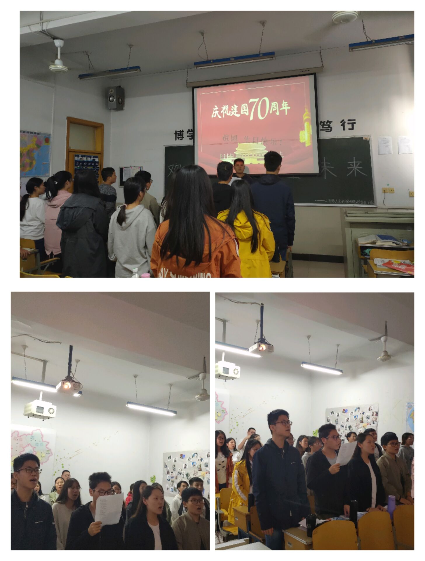 为迎接中华人民共和国成立70周年,增强同学们的爱国热情,2018级人文地理与城乡规划专业于10月10日在第二教学楼212教室举办了“喜迎国庆,共筑国威”主题班会,辅导员黄晓老师及全体同学参加。 在朗朗诵读声中,班会进入第一环节“祖国,我爱您”,同学们朗诵自己撰写的爱国文章,讴歌祖国七十年的伟大成就、赞美国庆阅兵的壮观雄武。第二环节,同学们共同观看爱国影片《拾年》,深切感受了中华人民共和国成立70周年以来的发展历程与伟大成就。最后,全班同学合唱“歌唱祖国”,“五星红旗迎风飘扬,胜利歌声多么响亮…”同学们以铿锵激昂的嘹亮歌声表达自己对伟大祖国的无限赞颂。 此次主题班会的成功举办,极大地增强了同学们的爱国热情,同学们倍受鼓舞,纷纷表示认真学习专业知识,提升创新能力,努力将自己培养成一名合格的社会主义建设者和接班人。