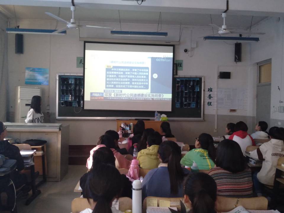 为继承和发扬中华民族的传统美德,提高大学生的道德修养,促进同学们的全面发展。2019年10月31日,2019级地理科学1班在第二教学楼304教室组织学习《新时代公民道德建设实施纲要》。团支书李婧作为讲解员为同学们进行了详细解说。 中国特色社会主义进入新时代,加强公民道德建设,提高全社会道德水平,是全面建成小康社会,全面建设社会主义现代化强国的战略任务。在学习过程中,团支书李婧为我们详细的介绍了新时代大学生要培养的道德品质。坚持共产主义道德,强化道德认同,争做新时代的良好公民。接下来,同学们又观看了有关纲要的视频,进一步明确了当代青年追求的道德水平,鼓励同学们诚实守信,热情服务,奉献社会。同时坚决抵制个人主义盛行,不断提升自我修养,促进同学们全面发展。 此次学习活动的顺利开展,旨在培养造就担当民族复兴大任的时代新人。通过这次纲要的学习,不仅引导同学们明大义,守公德,严私德,而且有利于学部弘扬民族精神与时代精神。最重要的是,彰显了学院立德树人的信念以及培育和践行社会主义核心价值观信心。