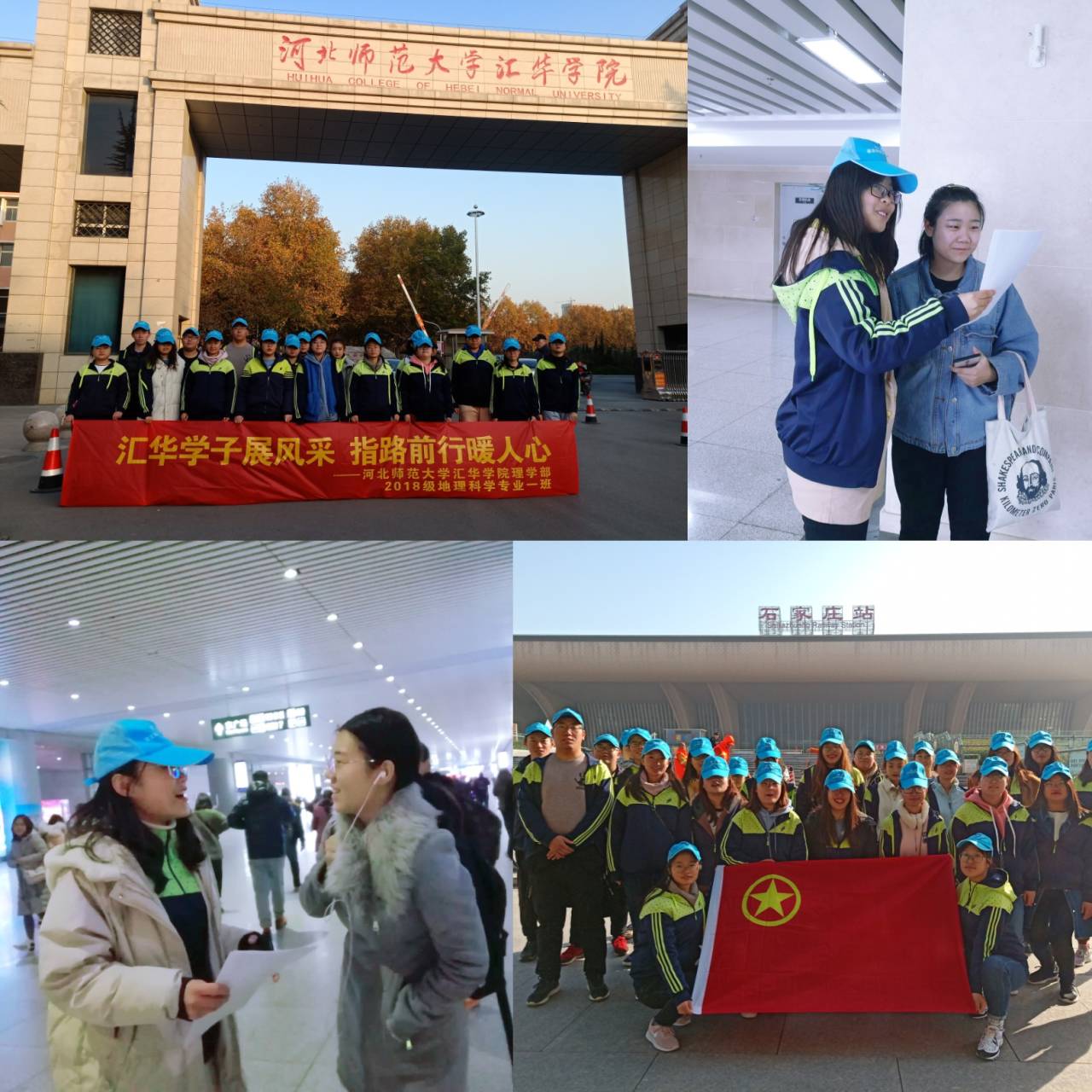 为弘扬当代大学生“奉献,友爱,互助,进步”的志愿精神,发挥当代大学生的示范引领作用,11月19日,2018级地理科学1班赴石家庄火车站开展了以“汇华学子展风采,指路前行暖人心”为主题的志愿服务活动,旨在通过此次活动增强同学们的责任感和归属感。 此次活动主要针对石家庄站内的外地乘客提供线路指引,行李搬运等服务,方便乘客出行。活动前期,同学们积极查询火车站周围公交干线,并将火车站周围的公交站点标注在地图上,以便更快地帮助乘客。活动当天,本班成员分为十小组,分别在石家庄站的东广场和西广场为乘客提供帮助。各小组主动上前询问,细心解答,耐心指引,结合准备好的路线图和平面图,为乘客提供出行路线,并主动帮助部分乘客拿行李,在冬日里为乘客送一份温暖。经过两小时的志愿服务,本次活动共帮助百余名乘客,受到了数名乘客的好评。 2018级地理科学1班始终秉持着“志愿服务创和谐,社会实践促成长”的理念,积极开展多项志愿服务活动。此次活动不仅在弘扬志愿精神的同时引导同学们树立了服务社会意识,更展现了汇华学子良好的自身素质和积极向上的精神面貌。最重要的是,此次活动使同学们明确了社会责任,为学院培养出新时代人才奉献出了一份力量。