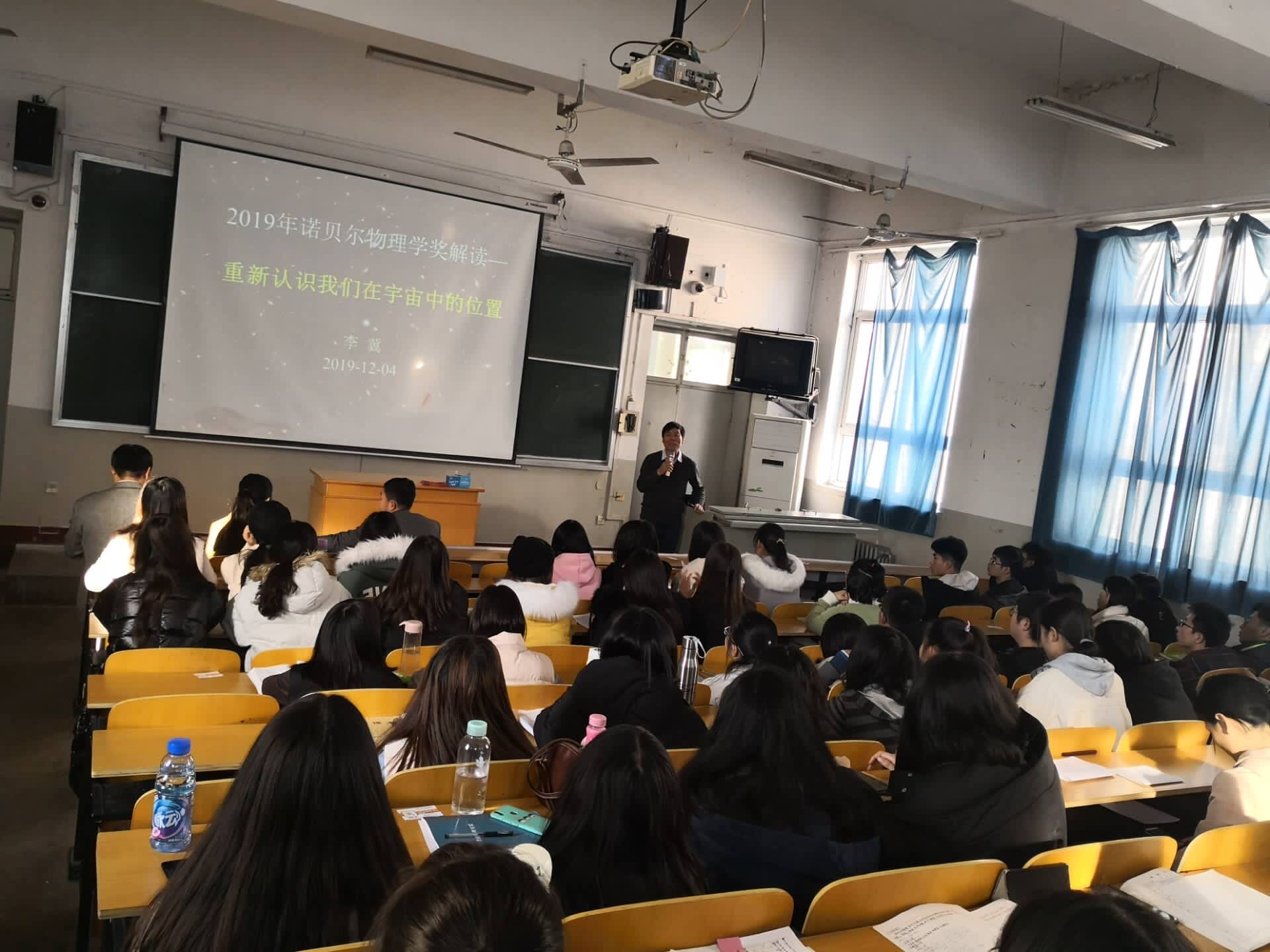 12月4日下午,物理学院天文学教授,天体物理硕士研究生导师李冀教授于第二教学楼204教室开展了“重新认识我们在宇宙中的位置”2019年诺贝尔物理奖解读专业讲座,理学部副部长郭绍福老师、2018级物理学专业辅导员赵红菊老师、2018级和2019级物理学专业全体同学参加讲座。 讲座伊始,李冀教授介绍了2019年获得诺贝尔物理奖的三位科学家,加拿大-美国物理学家吉姆·皮布尔斯和瑞士物理学家米歇尔·麦耶和迪迪埃·奎罗兹,并为我们普及了宇宙学与天文学的发展历程以及2019年诺贝尔物理学奖获得者皮布尔斯教授关于“宇宙微波背景辐射的定量研究”、“热大爆炸核合成”、“宇宙的结构和组成”等方面的知识。同学们了解更多获得诺贝尔物理奖背后科学家们的故事并改变了我们对宇宙的看法。李教授语言风趣幽默,讲座现场气氛活跃,同学们踊跃发言,积极互动。 此次讲座,李教授以诙谐幽默的方式将难以理解的物理知识变得生动形象,让同学们对天体物理学有了全新的认识。
