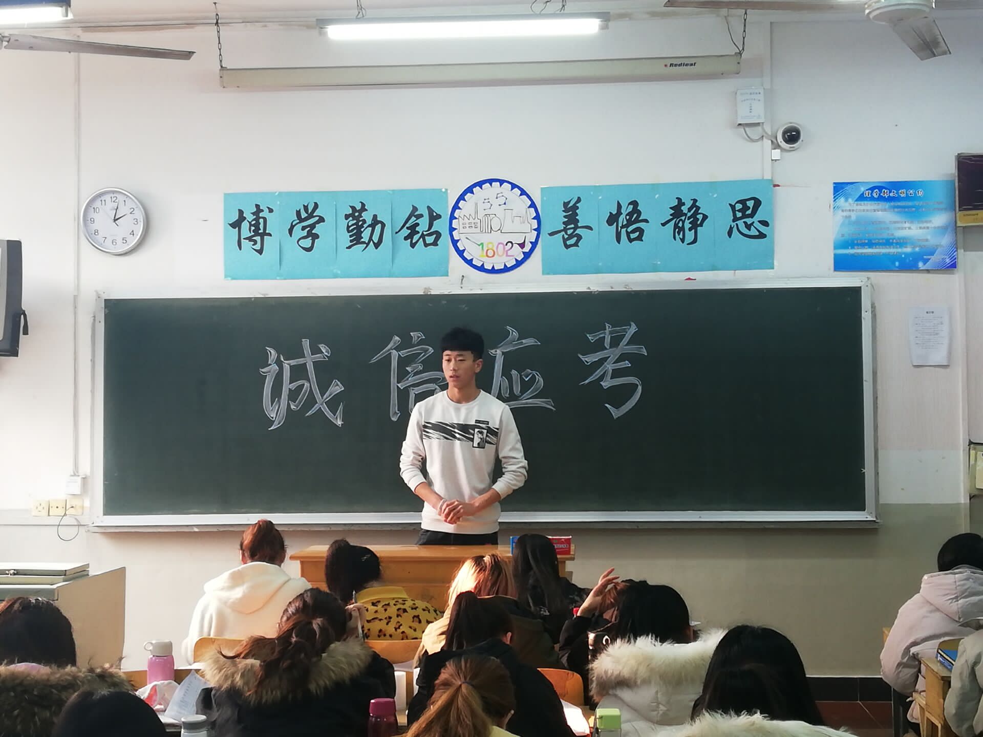 在临近期末考试来临之际,我们身为当代大学生应该诚实守信,做文明考生,为增强同学们对诚信应考的认识,增强反对虚假和不守信用行为的思想意识,做一名诚信的大学生,12月16日,2018级化学2班全体同学于第二教学楼214教室开展“诚信守信,文明应考”主题班会。 班会伊始,由班长为同学们讲到诚信考试应该做到以下三点:一是排除外界干扰,正确认识考试的重要性;二是提高自身修养;三是考试过程中尊重监考老师,端正考试态度。并将弘扬诚信正义贯穿于班会始终。班会临近结束,他还带领同学们进行考前宣誓,同学们积极配合并声音洪亮的进行宣誓:熟悉制度,积极执行;认真复习,积极备考;手握诚信,积极应考。 此次班会中强调了诚信的重要性,它是为人的一项重要的基本原则,正所谓“诚信乃是为人之本”。诚实之于人,如翅膀之于鸟,通过此次班会,同学们受益匪浅,深刻的认识到了在现代社会中,无论做人还是做事,诚信都是必不可少的素质。