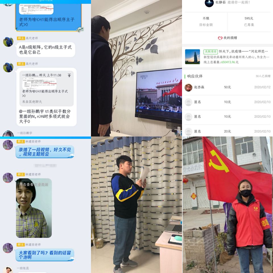 为了贯彻习近平总书记关于坚决打赢疫情防控阻击战的重要指示精神,积极响应学院“停课不停学”的号召,树立我班学生战胜新冠肺炎疫情的坚定信心,自3月2日起,在辅导员林建丽老师的指导下,2019级数学与应用数学1班顺利开展“专注学习,共同抗疫”系列活动。 驰援武汉,我们在行动 在这场抗“疫”战中,我班全体同学立志不做局外人,在学习之余密切关注疫情发展,从初期的集体参与“驰援武汉”捐款活动,到中期的录制“武汉加油,中国加油”视频,再到后期的多名同学以身作则,加入家乡防疫志愿者队伍,投身疫情防控战役,这每一个阶段都有我班学生活跃的身影。我们齐心协力,共同行动,一起为武汉加油,为中国加油! 专注学习,我们在努力 疫情防控阻击战开始后,我班全体同学积极迅速响应学院“停课不停学,学习不延期”的号召,通过QQ,钉钉,学习通等多个平台进行线上学习。课上同学们积极回答问题,学习新知识,掌握新技能;课下同学们纷纷制定学习计划表,自觉进行单词打卡,相互督促,相互帮助,为线上课堂及开学复课做准备。 共抗疫情,我们在路上 为做好疫情防控期间我班学生的思想政治工作,强调疫情防控期间需要特别注意的事项,树立我班学生战胜新冠肺炎疫情的坚定信心,辅导员林建丽老师通过QQ群带领全体学生召开“打赢战役,从我做起,我为疫情防控做贡献”线上主题班会,提倡不提前返校,认真对待网上教学,不信谣,不传谣,不造谣;提醒同学们每日按时上报体温状况,学会自我管理,做好个人防护;鼓励同学们在家适度锻炼,按时作息,以积极的心态面对疫情,为打赢疫情防控阻击战贡献出自己的最大力量。此外,在团支书杜静茹的带领下,我班全体同学共同举办了线上升国旗活动,并由班长李昱甫做国旗下讲话,鼓励同学们勇于承担防疫责任,履行防疫义务,共同打赢疫情防控阻击战。 通过“专注学习,共同抗疫”系列活动,同学们纷纷表示,一定会严格遵守学校和所在地党委政府关于疫情防控的各项措施,切实做好个人防护,勤奋学习,积极进取,展现Beat365唯一官方网站“超越自我,开创未来”的风采,彰显当代大学生的责任与担当,共同打赢疫情防控阻击战。