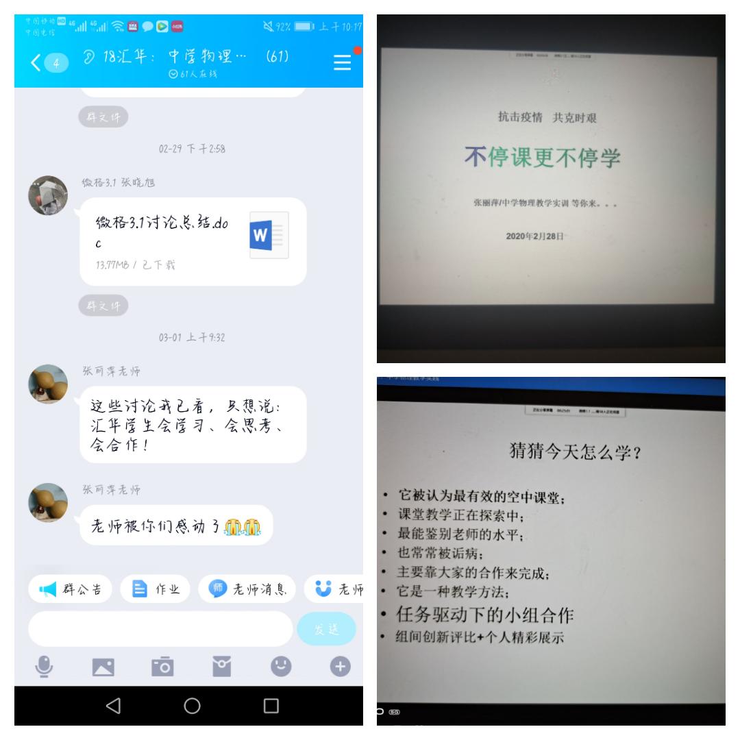2月28日下午,2018级物理学1班开展“不停课努力学——中学物理教学实训”空中课堂。张丽萍老师精神饱满、认真负责,同学们积极配合、热情高涨,在线出勤率达100%。 张老师认真备课,收集教学资料精心制作PPT,通过任务驱动下的小组合作探究式教学方式开展教学,涵盖:课堂直播、个人深度学习、组间头脑风暴和个人精彩展示。