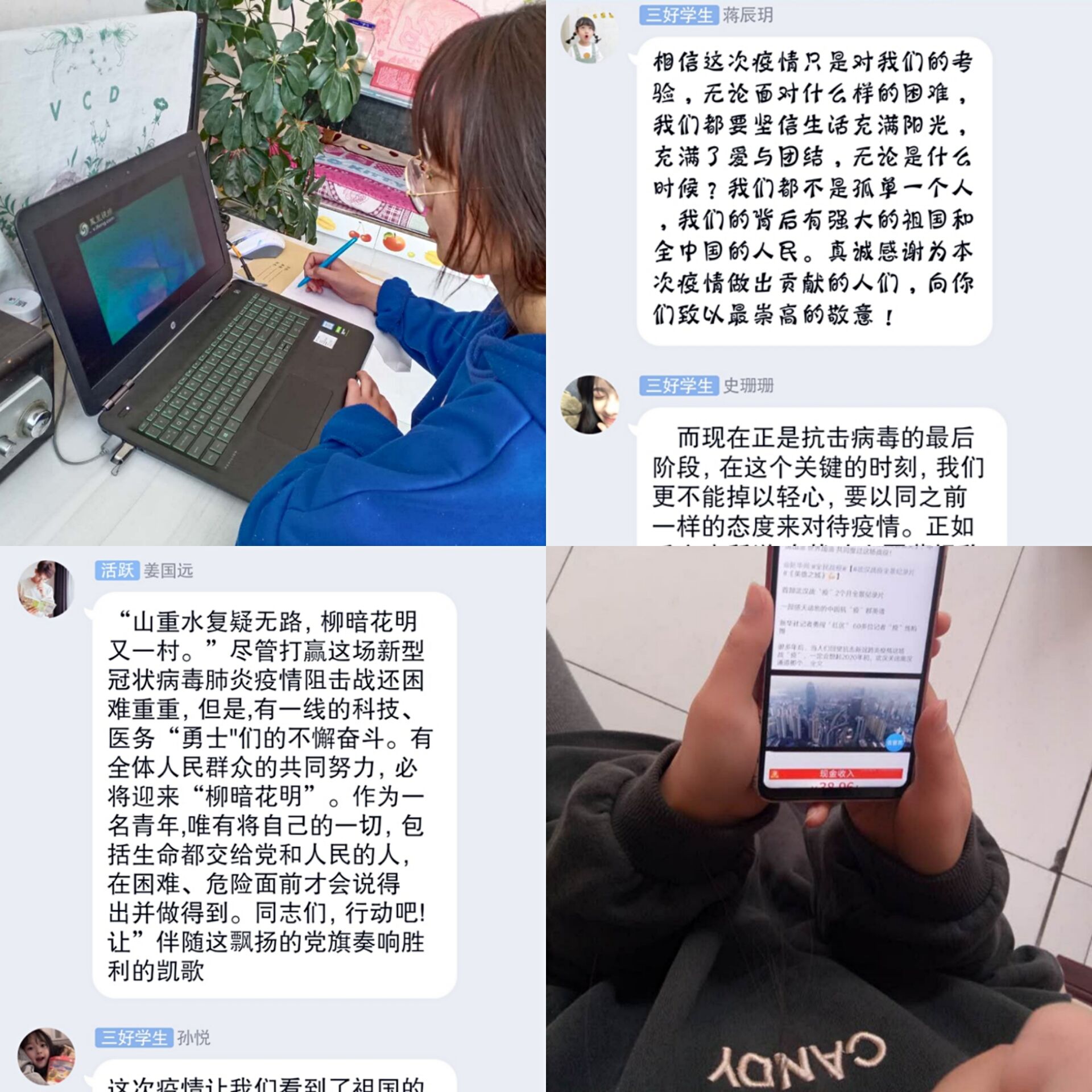 在全面开展防控疫情阻击战的特殊时期,全国上下为巩固疫情防控工作成果,严防因人员祭扫和聚集引发疫情传播及火灾事故,切实保护人民群众生命安全和身体健康,同时弘扬“文明祭扫、生态殡葬”的祭扫新风。因此,在清明期间为共同缅怀抗击疫情奋战一线牺牲的“勇士们”,学习他们无私奉献的精神品质,2018级化学2班全体同学于2020年4月1日通过线上开展“清明祭英烈、共铸中华魂”主题活动。 活动伊始,同学们通过新媒体平台自行观看武汉战疫纪录片《英雄之城》,在这座英雄之城,每个人都在努力做对的事,以他们的真心、无畏、正直和同情,助力打赢这场疫情防控的人民战争。一部感天动地的中国抗“疫”群英谱,打动了无数人民,在观看结束后,我们以宿舍为小组进行观后发言,在同学们的感慨发言中,可以深切地体会到作为大学生对于这次战“疫”的思考以及对奋战英雄的敬佩之情。 清明祭扫不在形式而在于心,不在人到而在心到。通过此次活动,更好地营造了向先进学习、致敬的浓郁氛围,弘扬了社会主义核心价值观,同时通过这次活动班委们再次强调了全体学生深刻认识并做好防疫工作的重要性和紧迫性,明确要求了要始终牢固树立“疫情就是命令,防控就是责任”的思想,积极配合领导及老师们的相关工作。