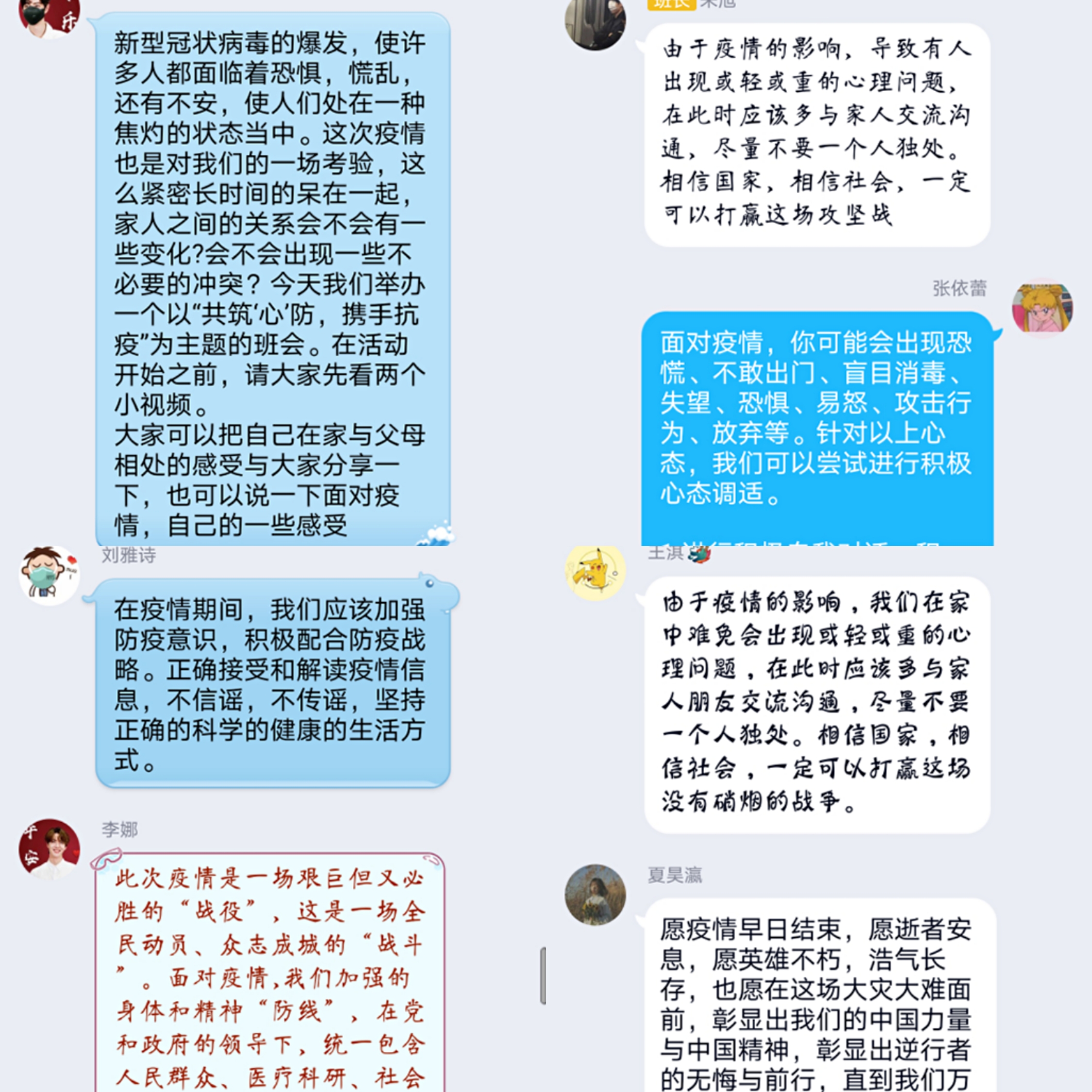 2020年注定让人难忘,疫情的蔓延,国人的团结,抗疫的斗争,时时刻刻都牵动我们的心。为了缓解同学们因疫情导致的负面情绪和心理压力,帮助同学们找到自己调节情绪和缓解压力的方法,进而引导同学们科学理性看待疫情,保持健康心态,2018级生物科学1班于4月5日开展了“共筑‘心’防,携手抗疫”线上主题班会。此次班会由心理委员王泽迪主持,2018级生物科学1班全体同学参加。 班会伊始,王泽迪分享了两则视频,引导同学们在疫情期间要正视自己的情绪反应,做好必要的防护工作;呼吁同学们要主动了解相关防疫知识,学会科学面对信息来源;同时要有所作为,有所行动,学会自助、善于求助和乐于互助,发挥青年大学生的先锋模范作用。紧接着同学们学习了心理防控手册,并围绕学生常见心理问题、心理健康判断标准、心理问题解决方法、人生价值取向等多个方面展开了热烈讨论,同学们纷纷发表见解与看法,畅谈自己在疫情期间的所感所想。大家一致表示,开学前一定调节好自己的状态,好好学习,以更饱满的精神风貌迎接返校。 本次班会充分发挥线上实时互动的优势,同学们敞开心扉,倾诉自己的负面情绪。在经过讨论与交流之后,同学们疫情期间的问题和矛盾都得到缓解。同时,此次心理班会也是在全民抗疫的伟大斗争中,2018级生物科学1班学子凝聚班级力量积极抗疫,弘扬爱国主义、集体主义、乐观主义的生动实践。